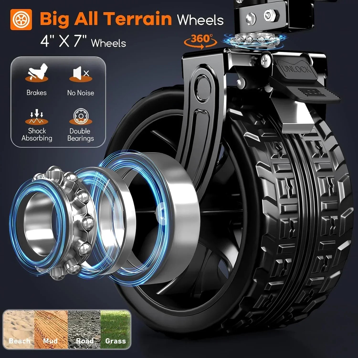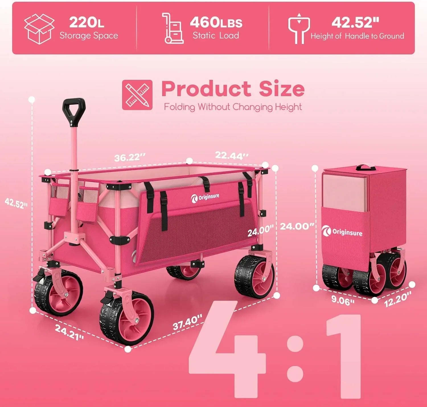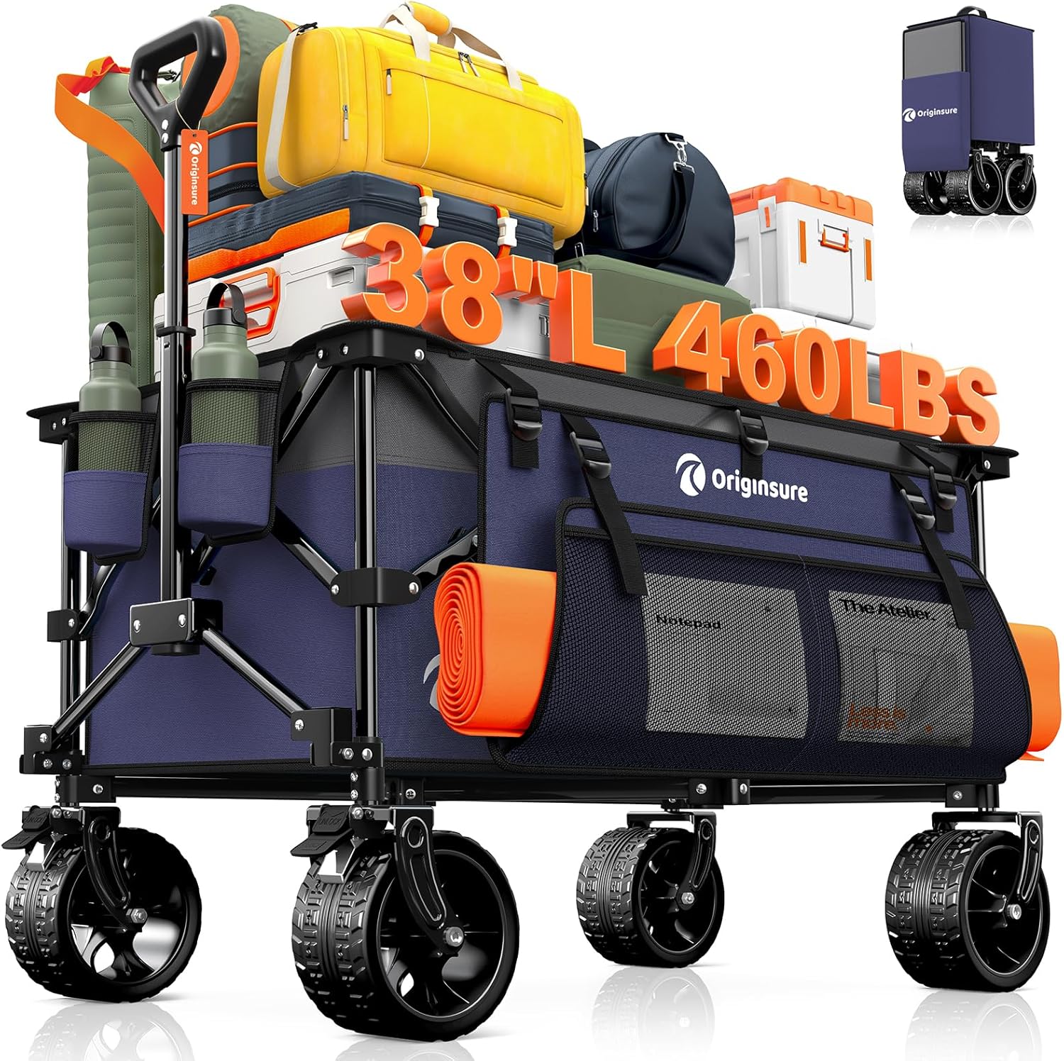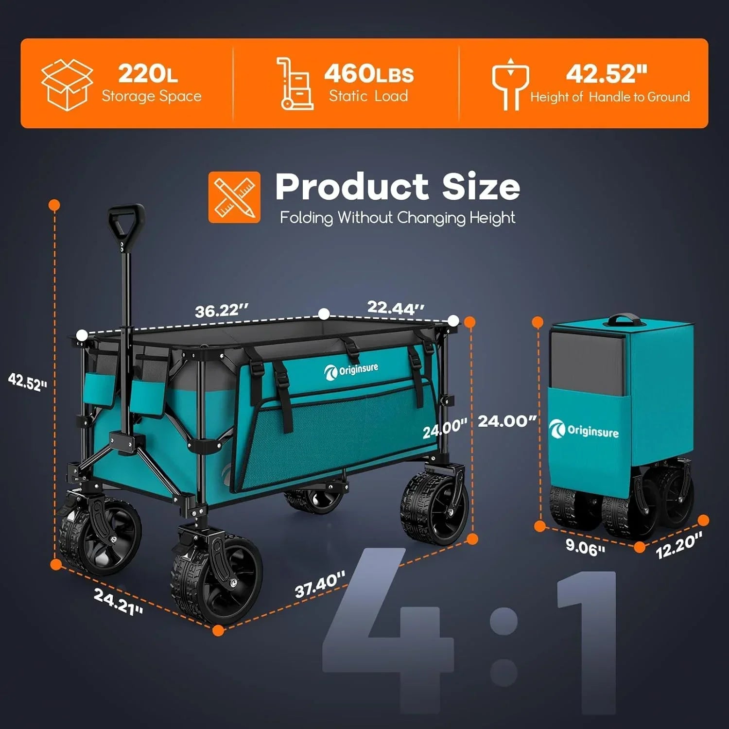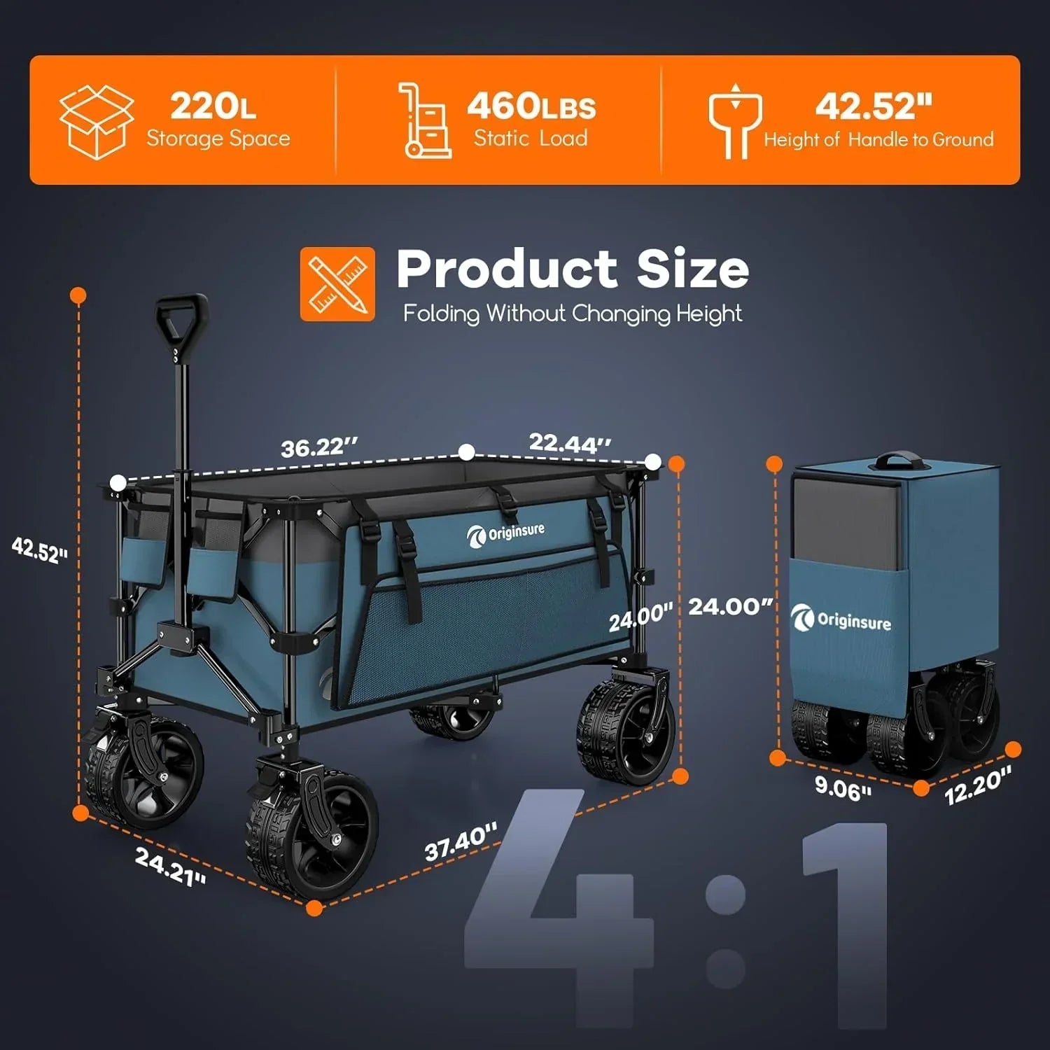 38" long foldable four-wheel stroller 460 lb capacity 220 liter folding beach stroller