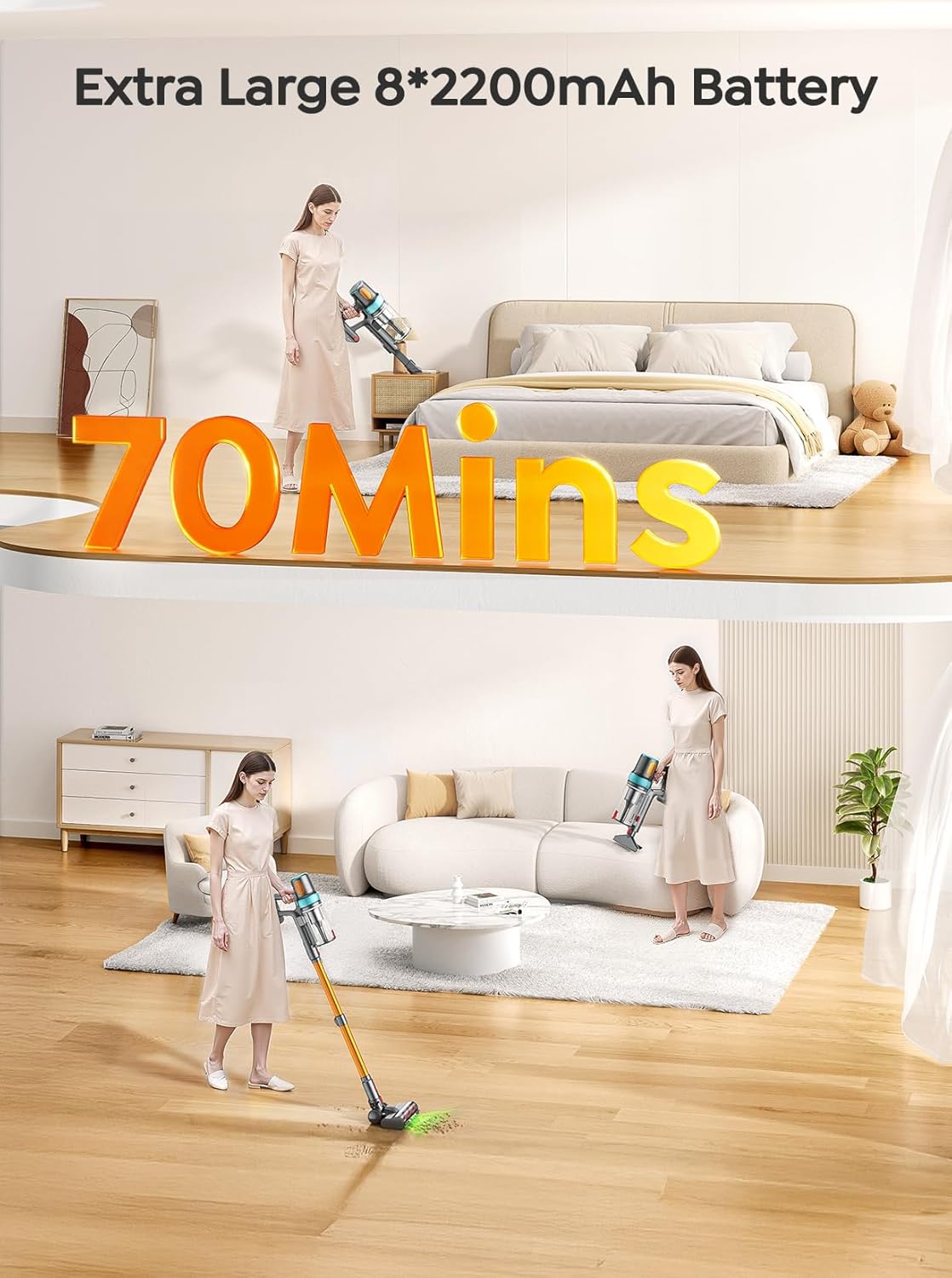 • ✨�?0Mins Long-Lasting Runtime】Portable Cordless stick vacuum cleaner is powered by a high-capacity robust 29.6V 8-cell battery pack, delivering up to 70 minutes of cleaning runtime in ECO mode (Standard mode: 30-35 mins, max mode: 15-20 mins). vacuum can clean an entire room on a single charge—perfect for home cleaning. The detachable battery design offers ultimate flexibility: buy a spare battery replacement to rotate for infinite runtime, eliminating range anxiety for larger homes. Keep it going strong. No more waiting for a recharge!