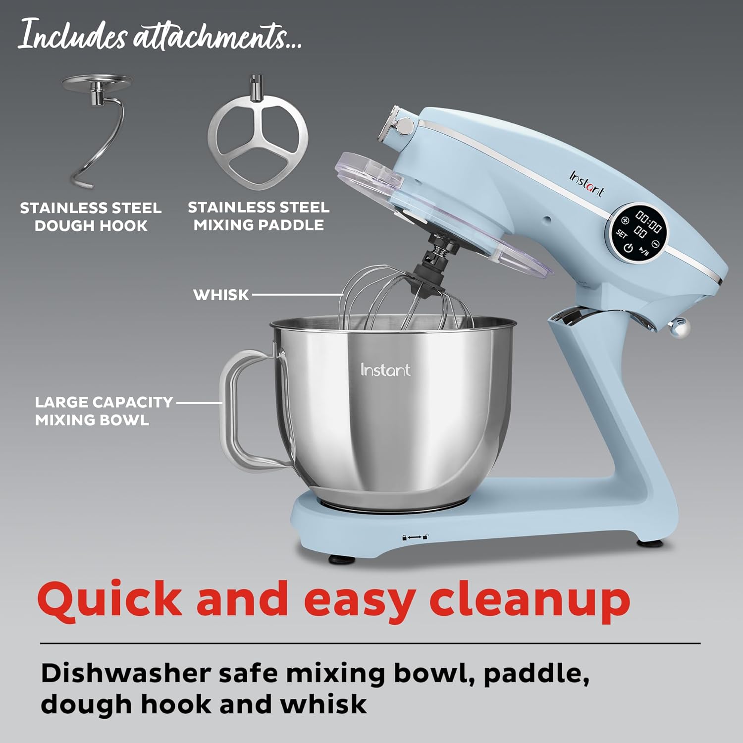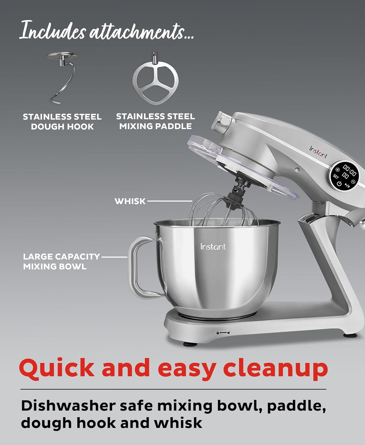 - Easy cleanup: dishwasher-safe stainless steel mixing bowl, paddle, dough hook and whisk