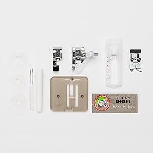 Included Components Presser Feet Included: General Purpose Foot (on machine), Blind Hem Foot, 4-Step Buttonhole Foot, Zipper Foot Standard Accessories: Bobbins, Needles, Seam Ripper, Darning Plate, Quick Start Guide, Instruction Manual