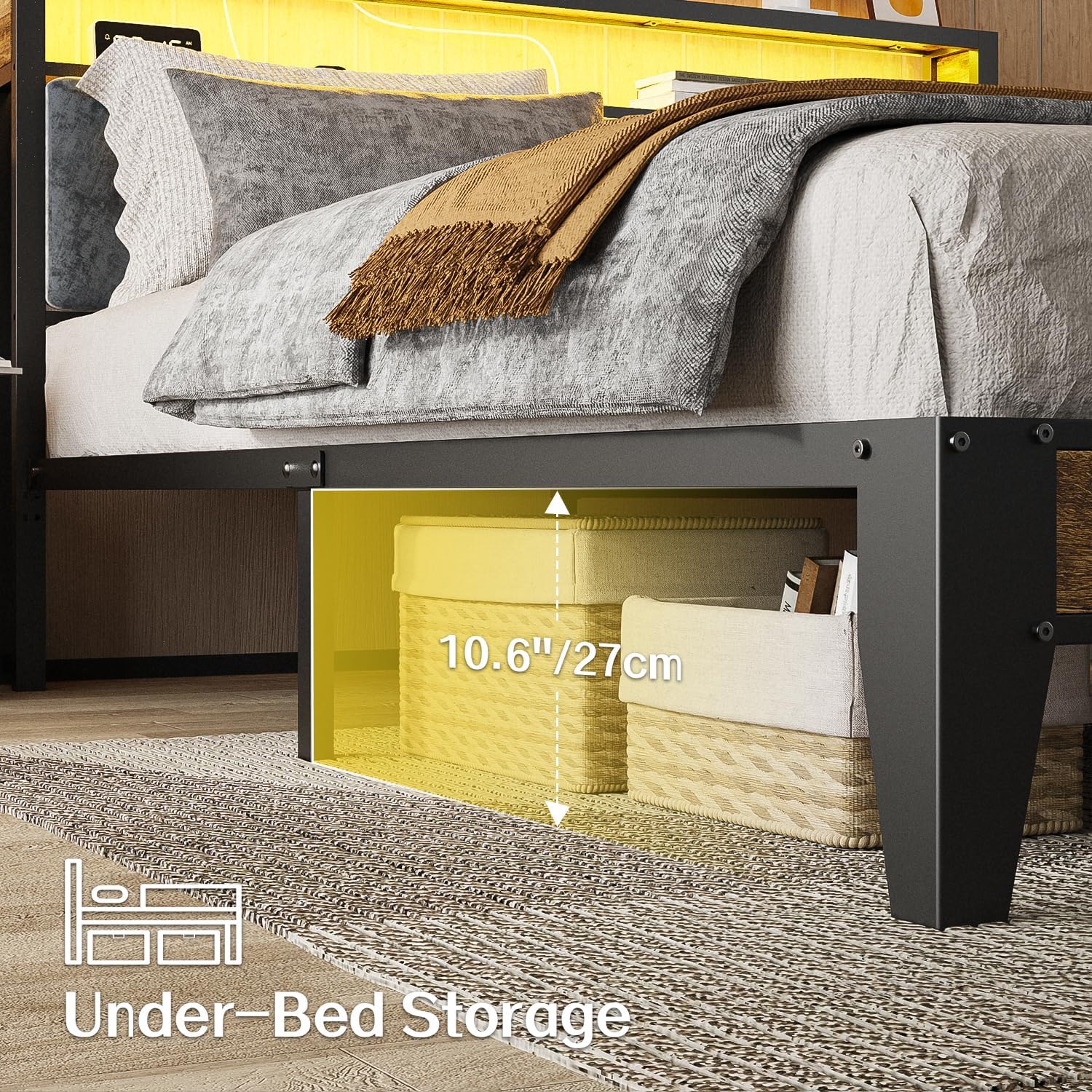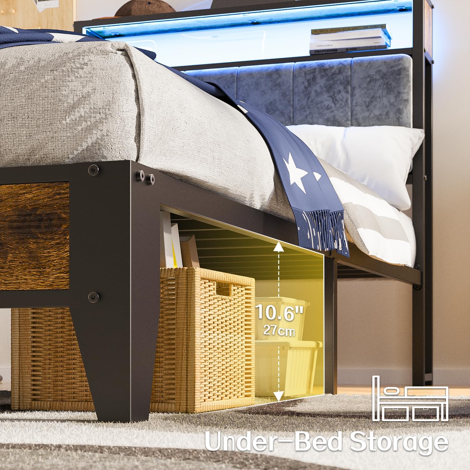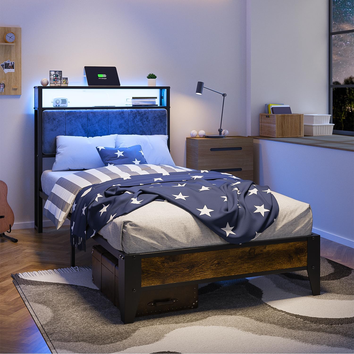 OLEVS Single Bed Frame LED Light Storage Headboard Charging Station Metal Platform Bed