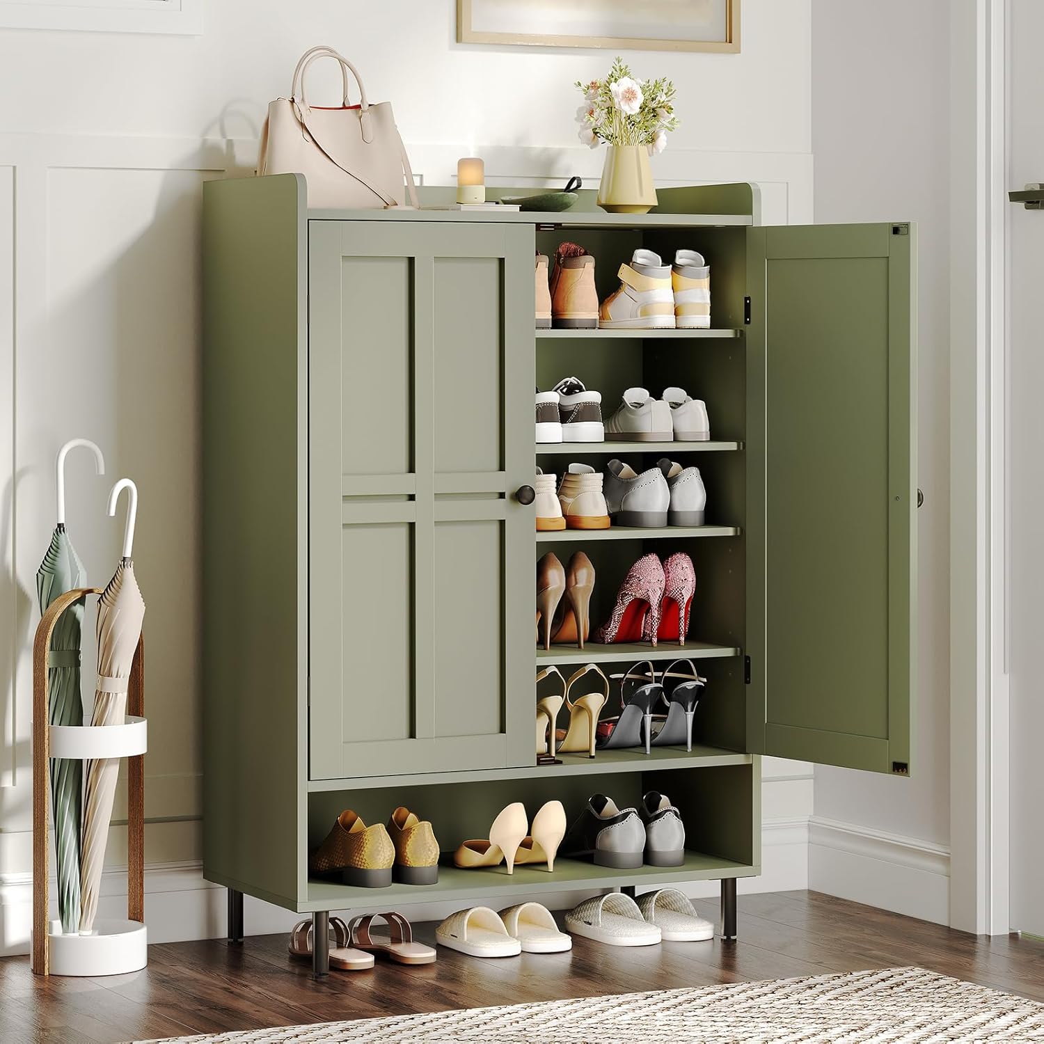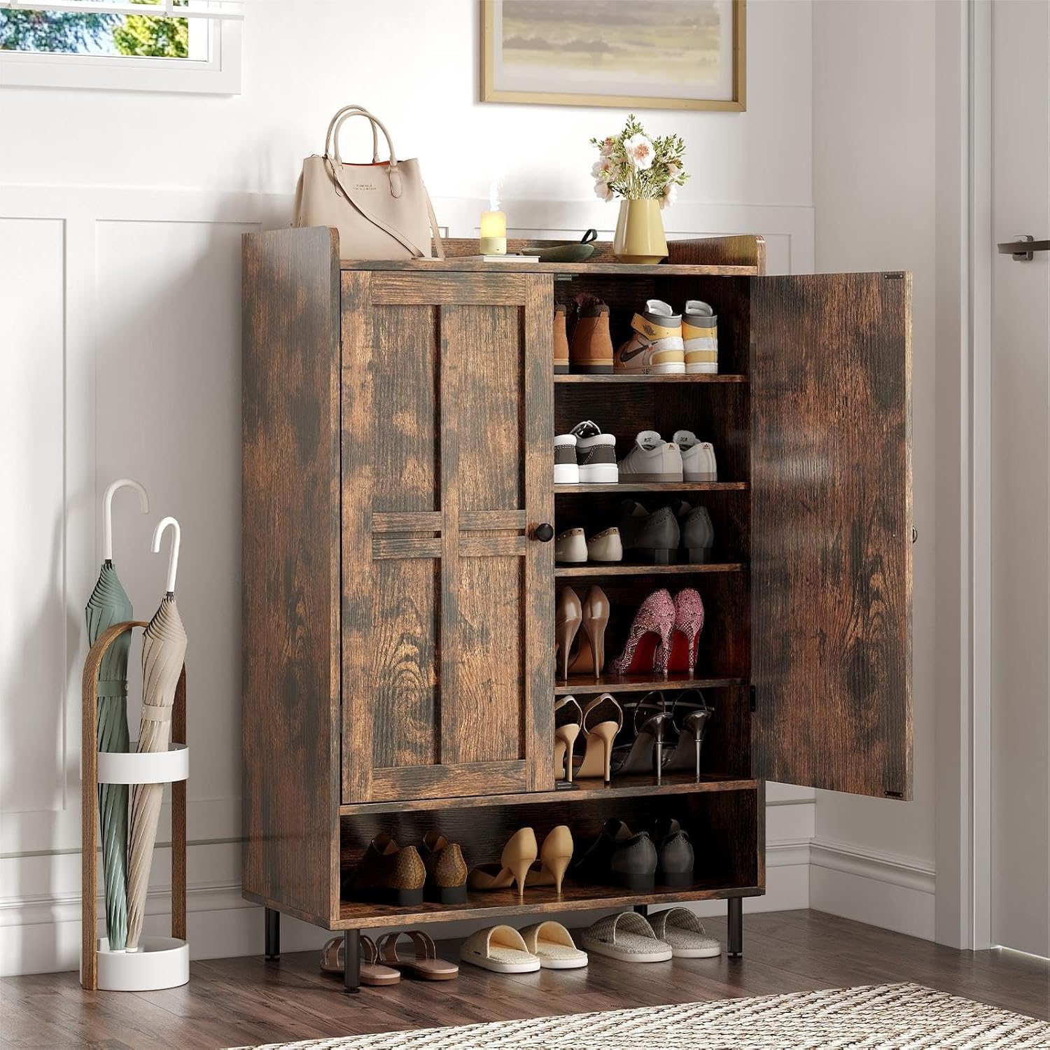 - Entryway Shoe Cabinet: Compared with flip drawers shoe cabinet, this shoe cabinet with doors is more convenient for you to organize different kinds of shoes. In addition to storing slippers, flat shoes, sneakers, it can also easily store boots, high heels, women's knee-highs, and even shoeboxes