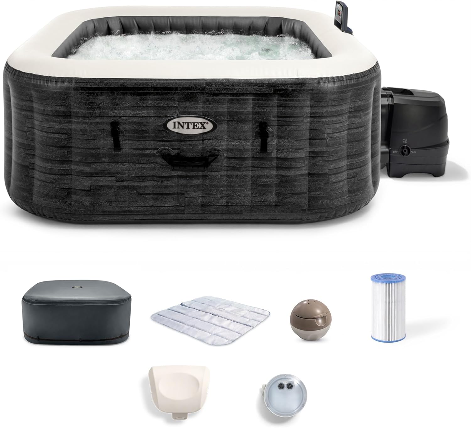 INTEX PureSpa Greystone Deluxe 4 Person Square Inflatable Hot Tub, Bubble Massage Spa