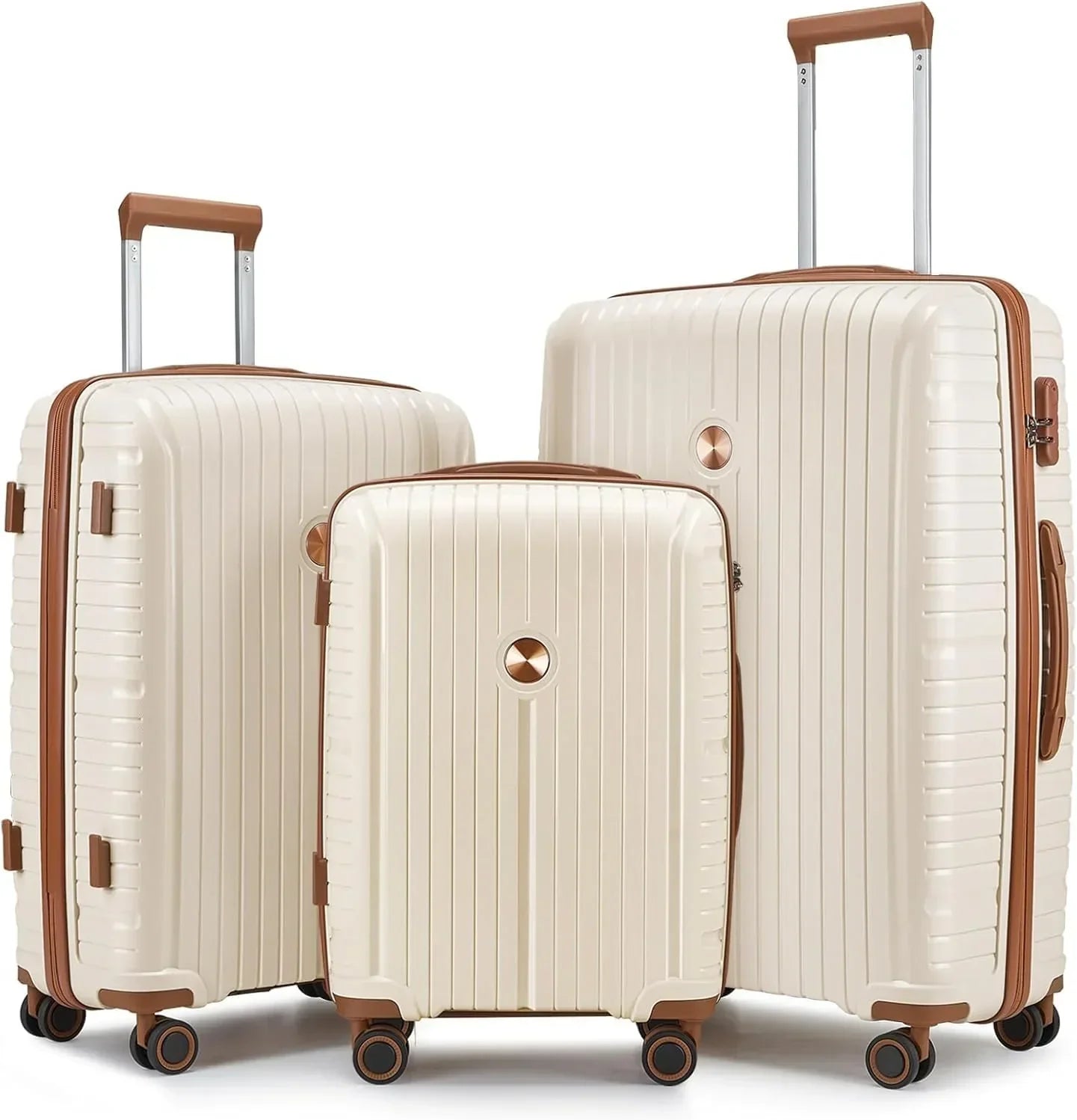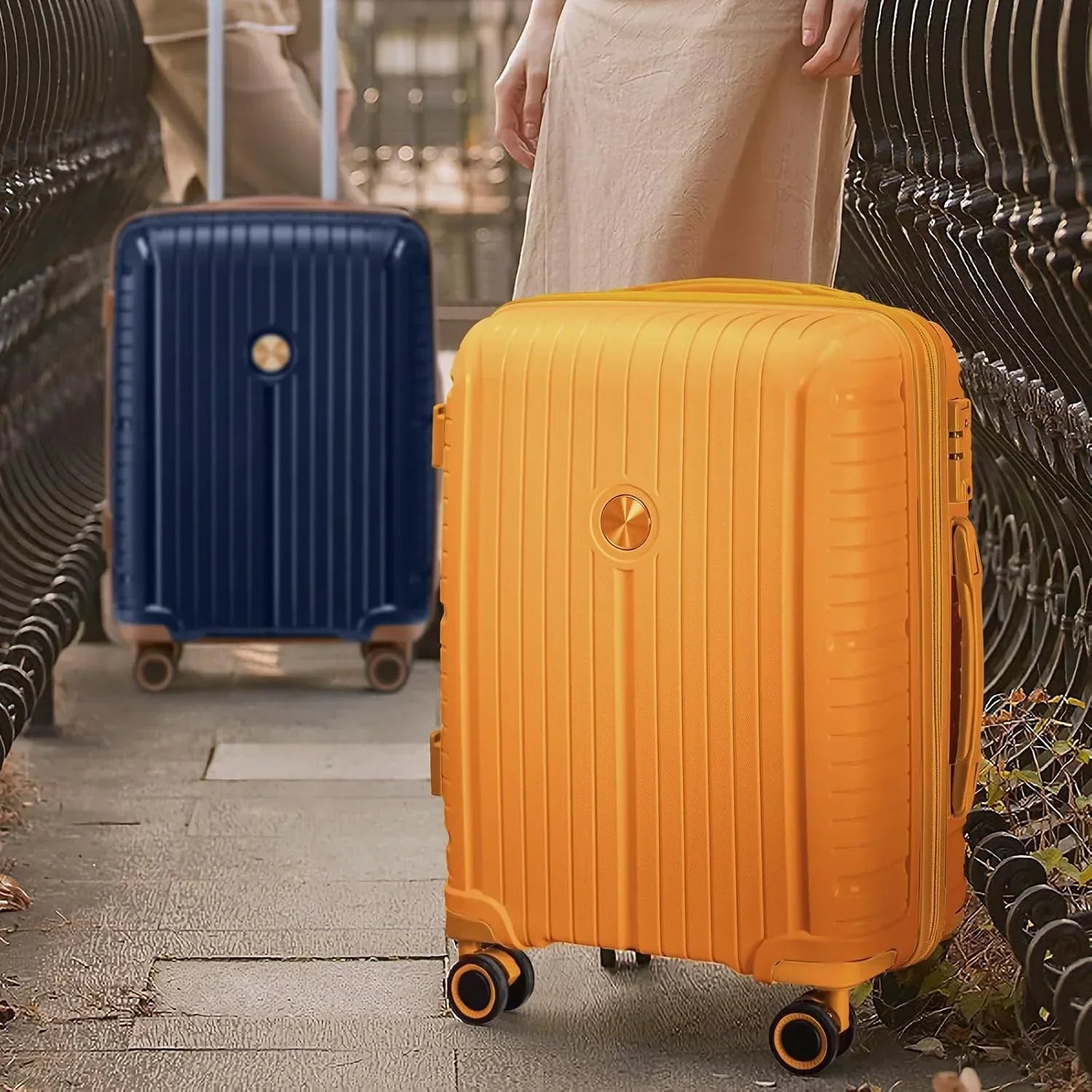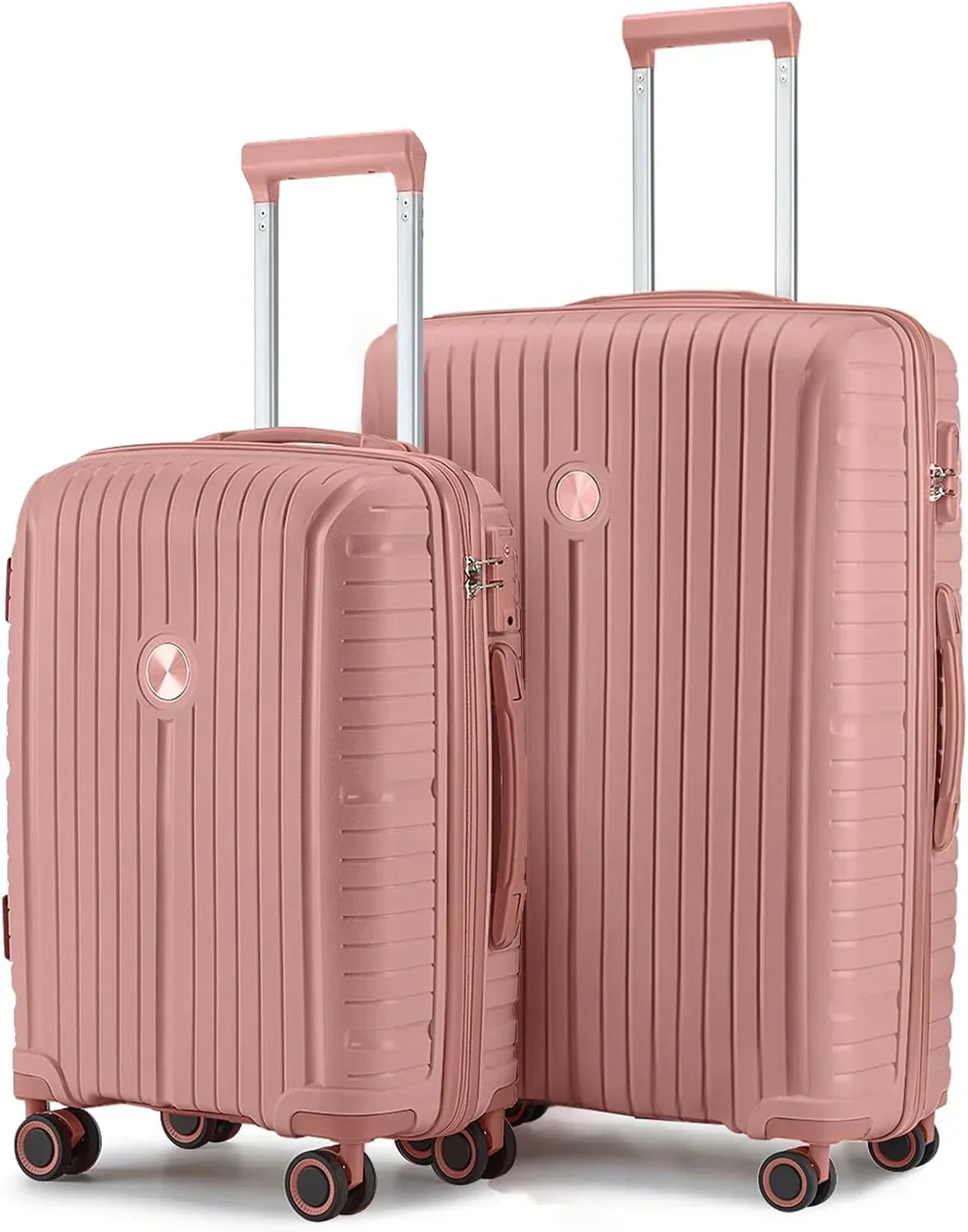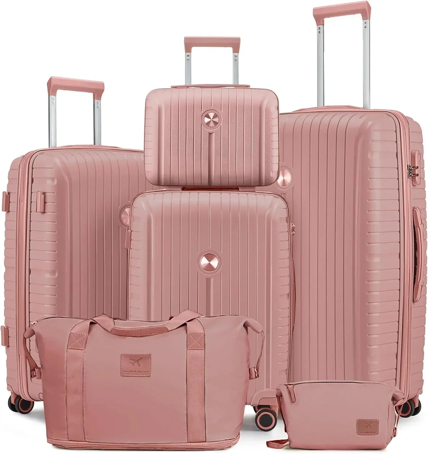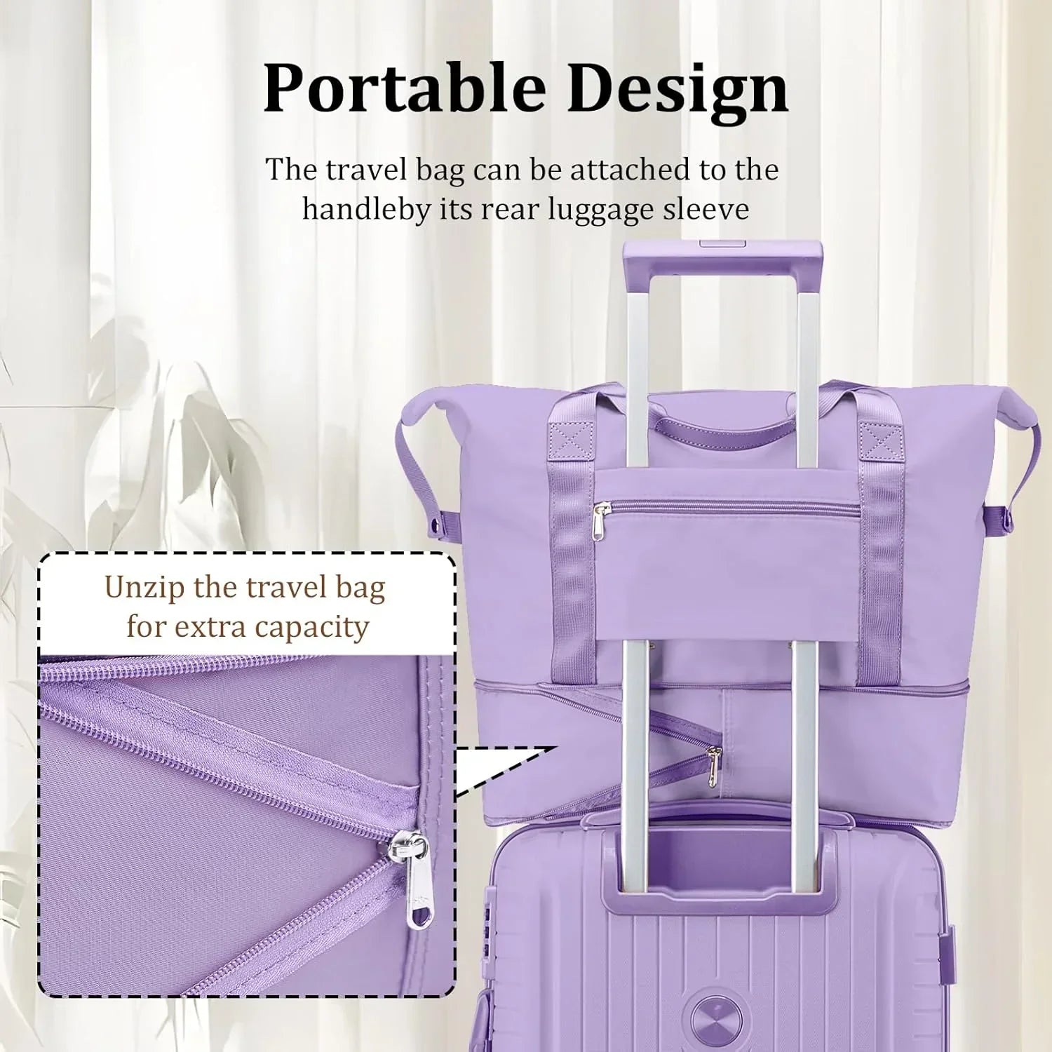 The duffel bag can be secured to the extended handle of the suitcase with a rear pocket sleeve