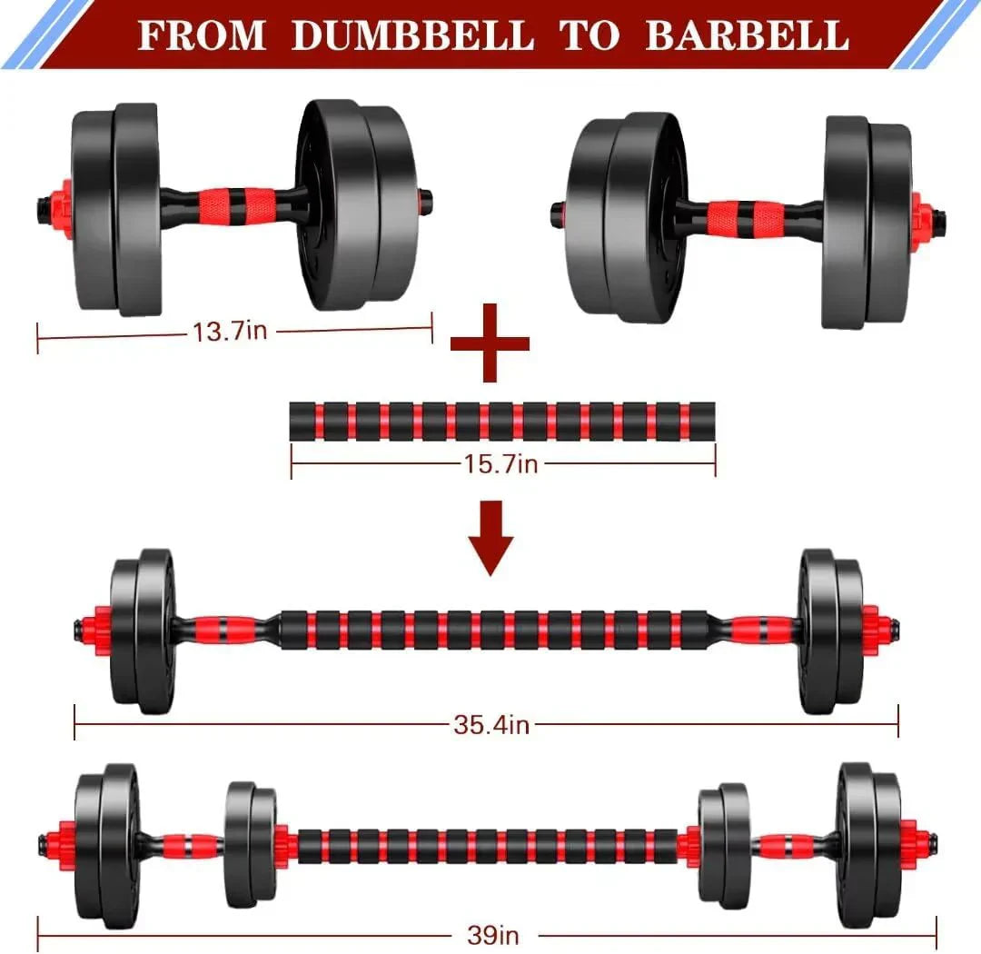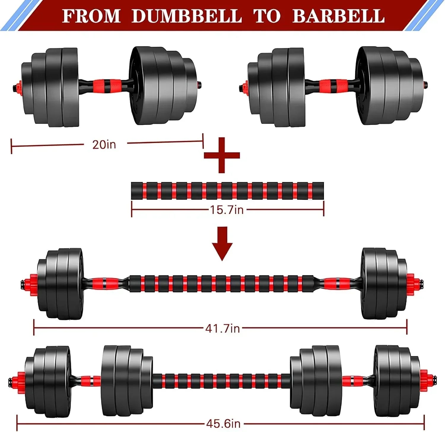 Adjustable dumbbell set, free weight dumbbell pair convertible into barbell