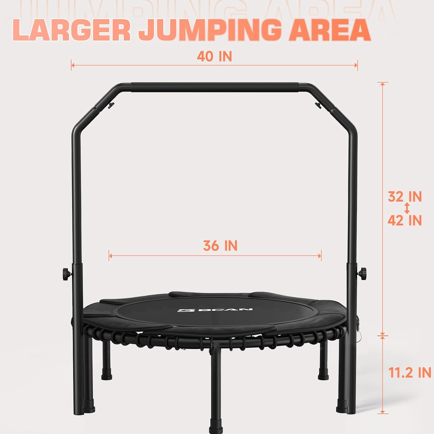 - 4-level Adjustable Handle: The fitness trampoline equipment with a 4-level height adjustable handlebar raged from 2'6" to 3'5" (on the mat), Jump with confidence