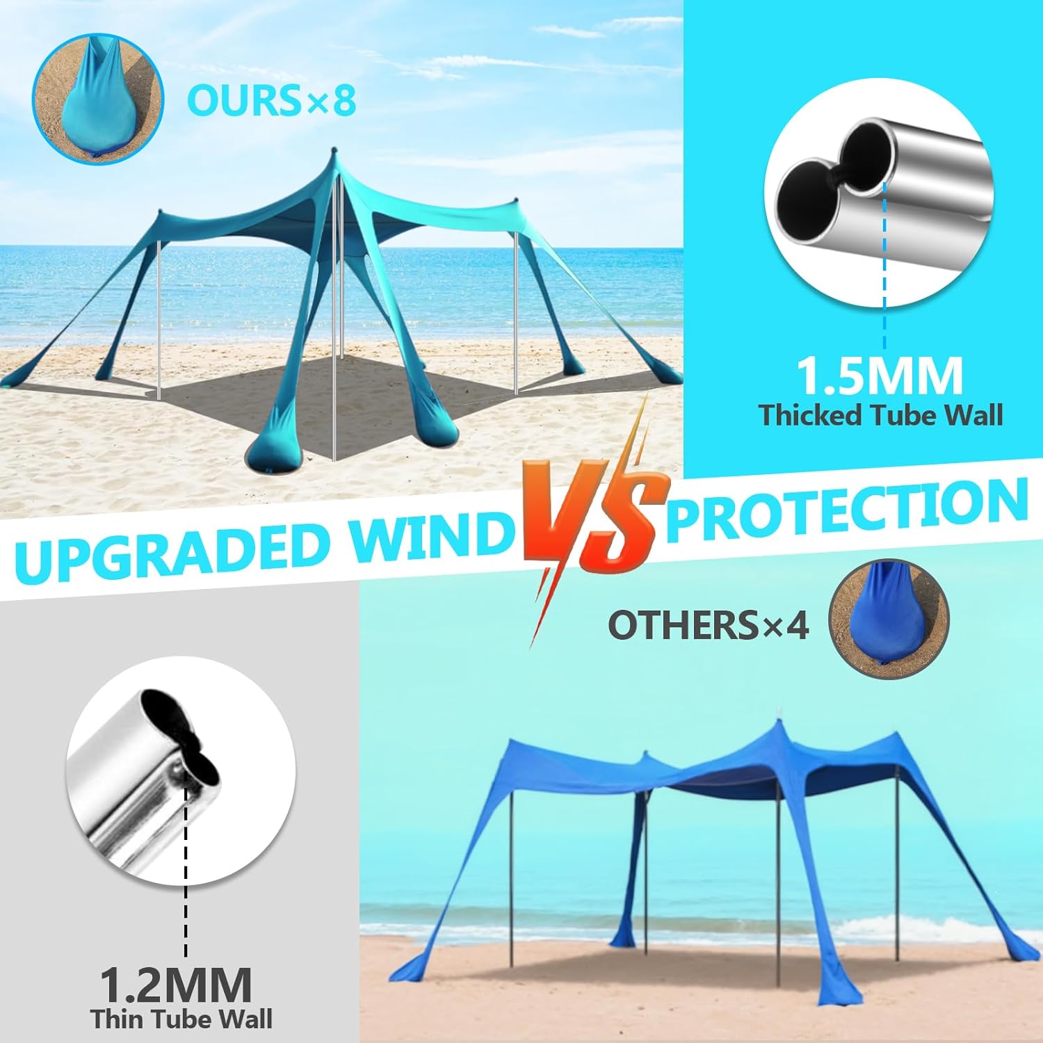 - Windproof & Sturdy Beach Tent - Upgraded with 8 sandbags, 4 reinforced aluminum poles, and 4 windproof ropes, our beach canopy stays secure against strong coastal winds—no collapsing, just reliable shade and stability.
