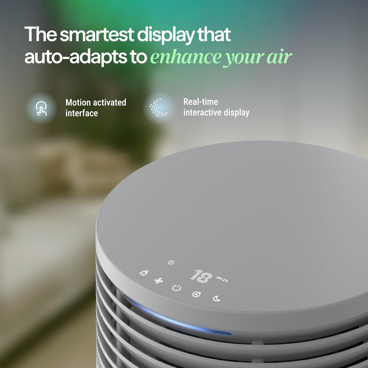 - GLANCEABLE AQI �?Discreetly built into the air outlet, the front air quality indicator displays real-time pollution levels with 5 easy-to-read colors—from excellent (blue) to poor (red)—plus a subtle animation when it's actively cleaning.
