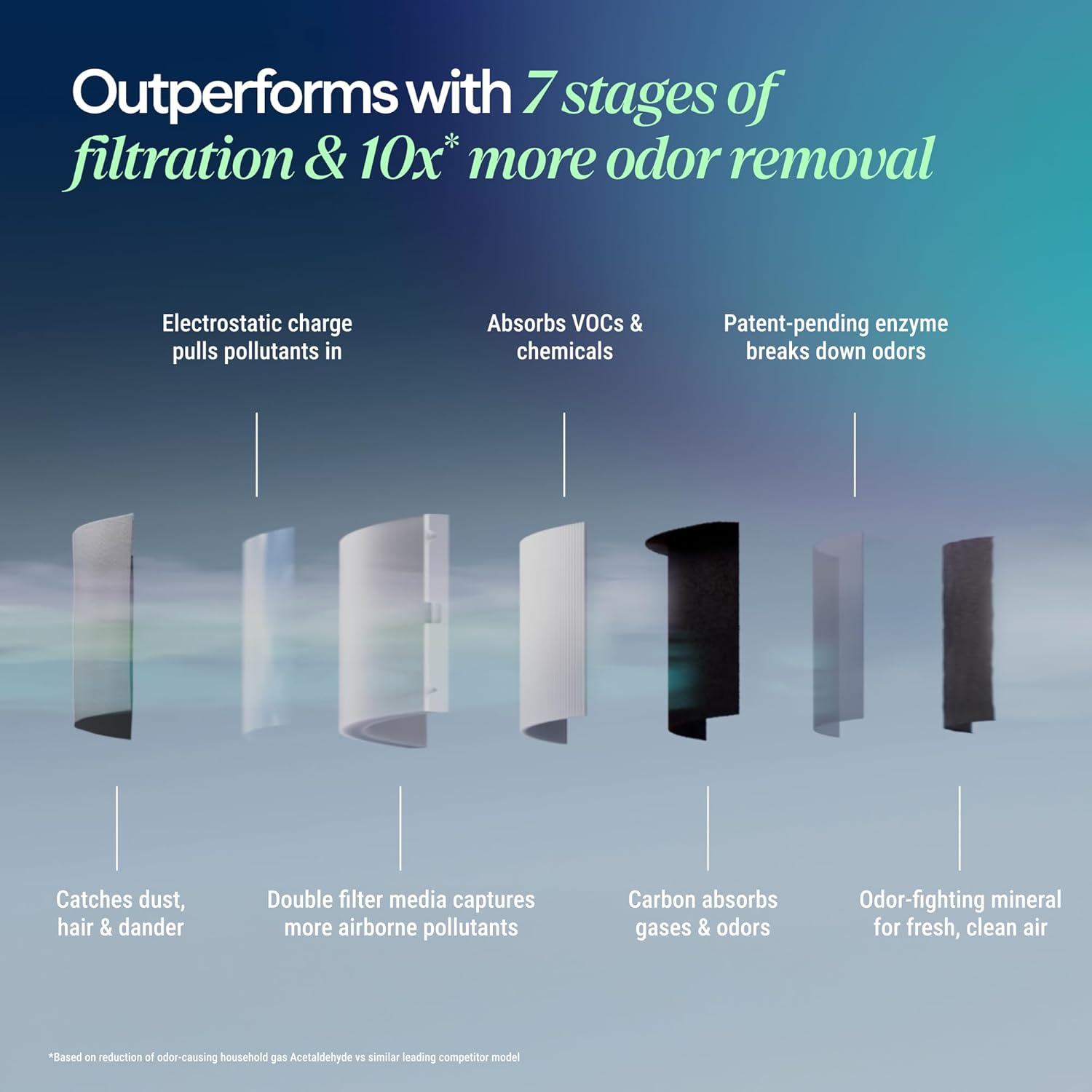 - 7-STAGE HEPASILENT FILTRATION �?Dual filtration captures 99.97%** of airborne particles down to 0.1 microns—including smoke, dust, and allergens—using mechanical and electrostatic technology. Surround Boost airflow and the OdorFence filter enhance whole-room purification by breaking down odors, gases, and VOCs with low noise and energy use.