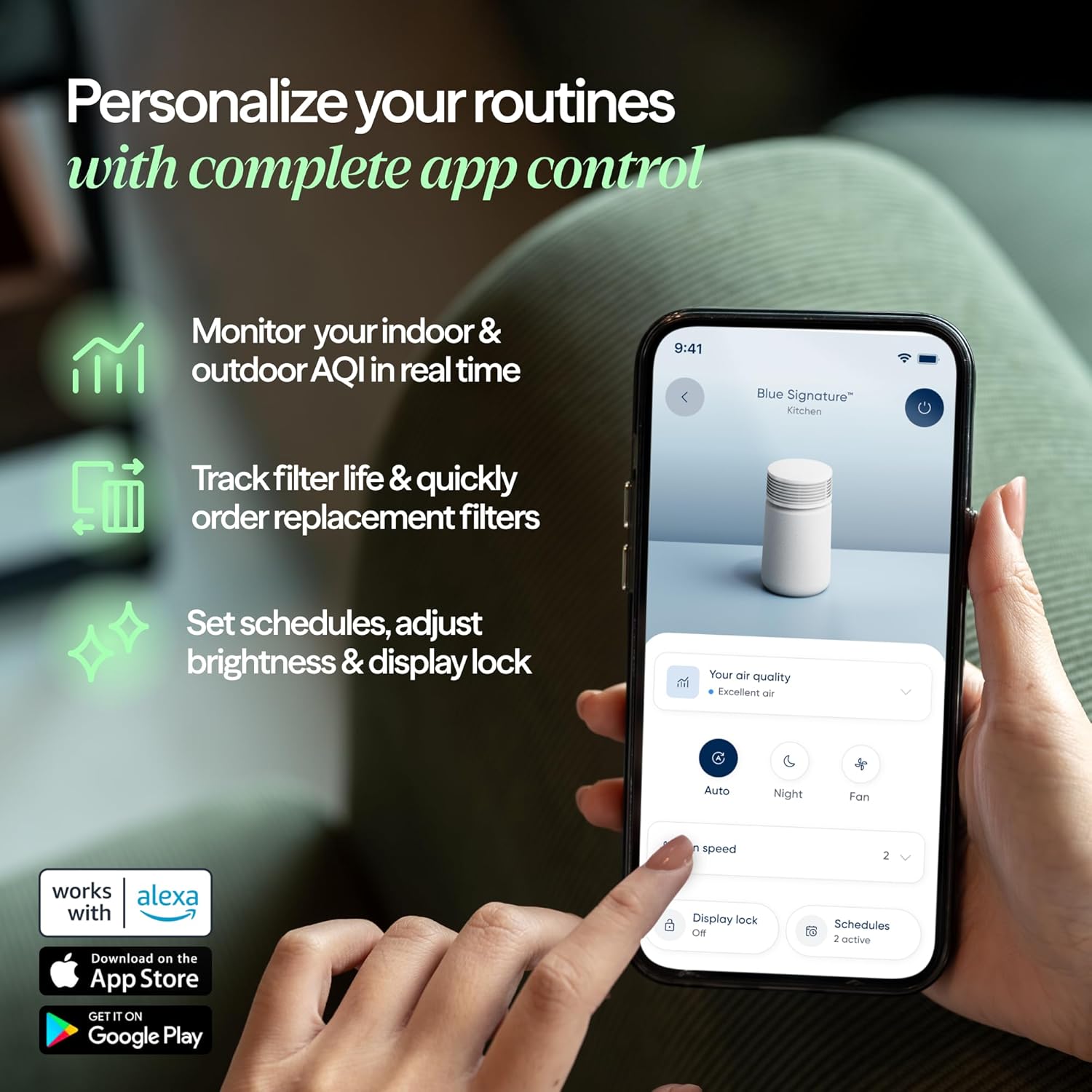 - APP CONTROL & VOICE ASSISTANT �?Customize settings, schedule cleanings, track indoor and outdoor air quality trends over time, and get filter replacement alerts—all from your phone. Compatible with Amazon Alexa and Google Home.