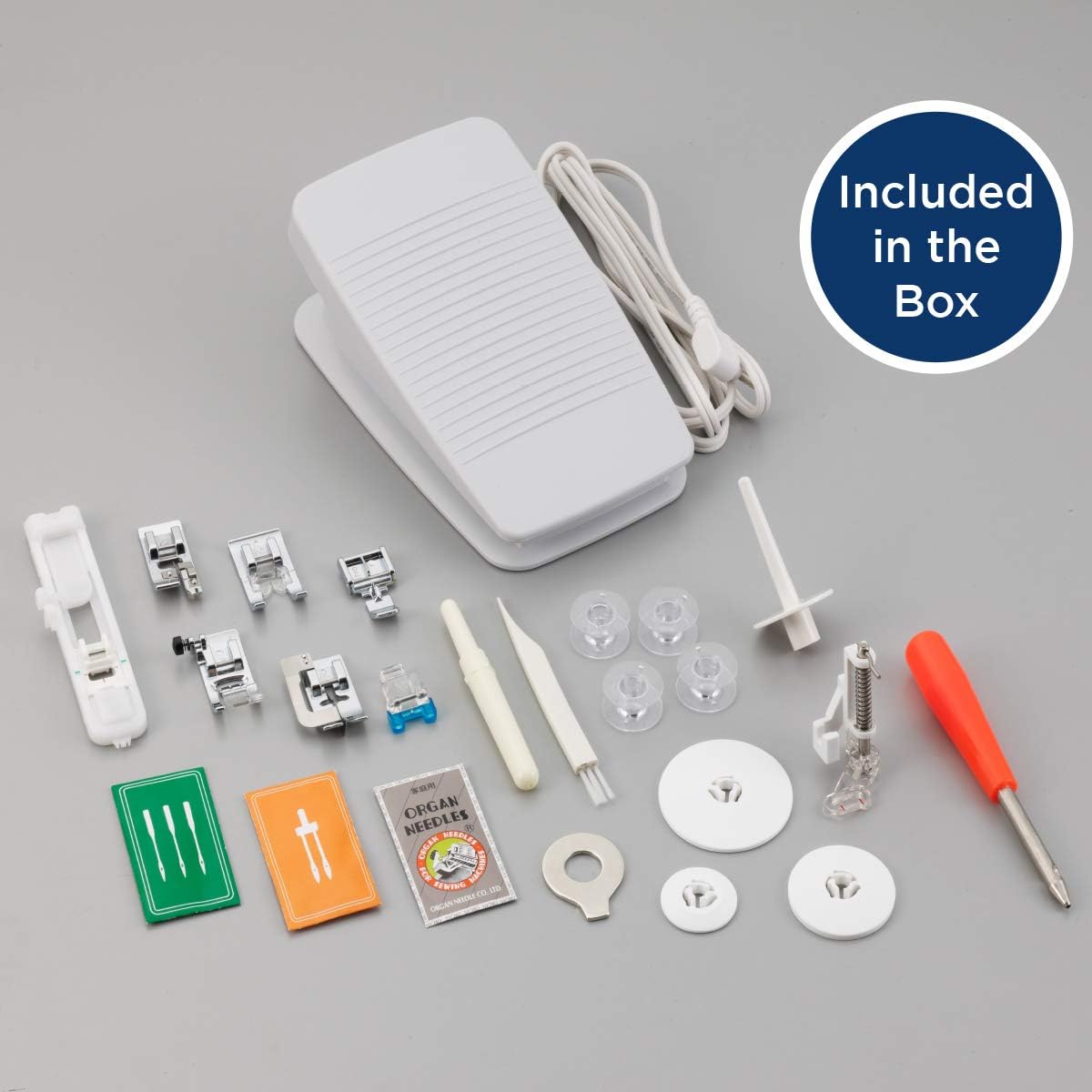 | Included Components | Carton Contents Accessory pouch with needle set, twin needle, ballpoint needle, bobbins (4), extra spool pin, seam ripper, cleaning brush, screwdriver, power cord, English/Spanish instructional DVD, English/Spanish operation manual|USB Cable Not Included|Warranty 25 Year Limited Warranty |