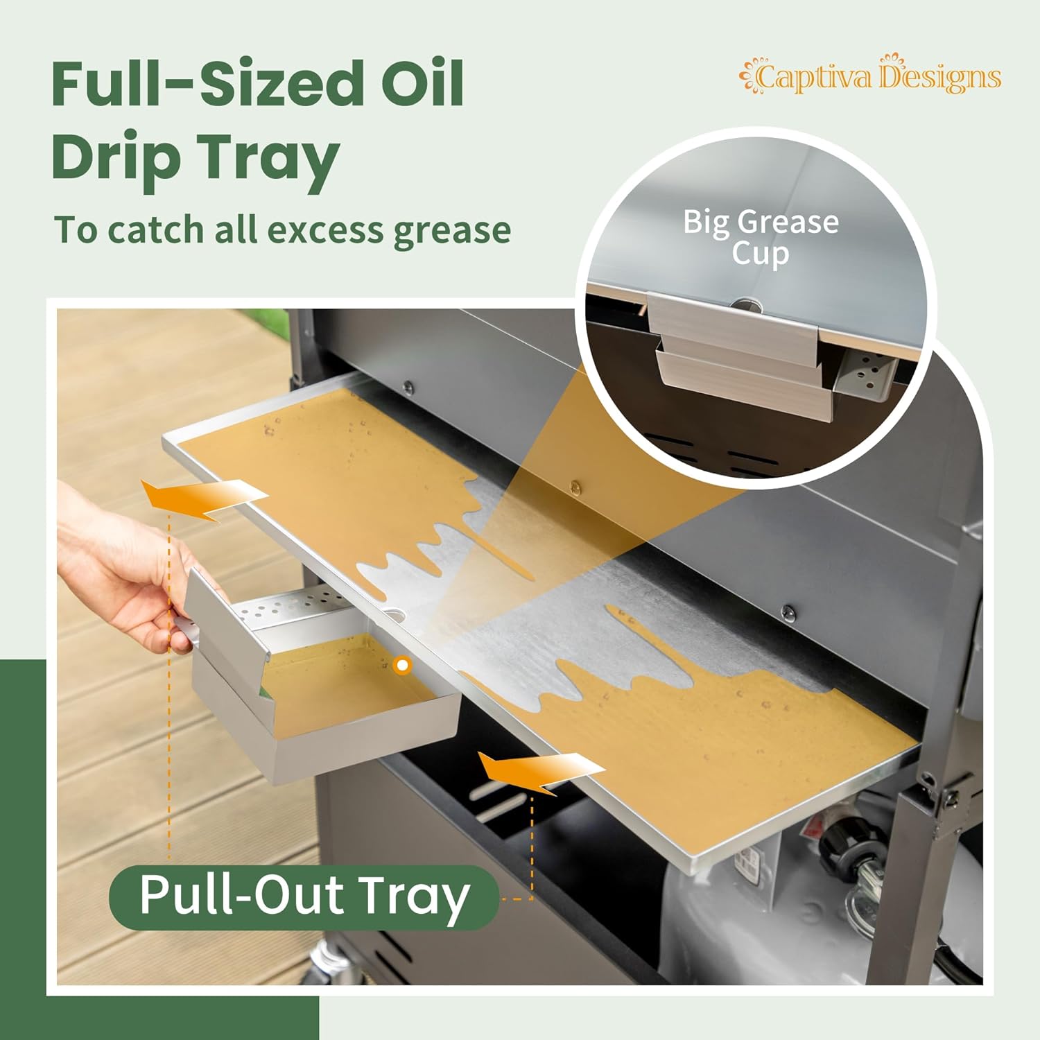 - 𝐄𝐚𝐬𝐲 𝐭𝐨 𝐂𝐥𝐞𝐚𝐧: The fullsize pullout oil drip tray design allows the grease and residue collected effectively during the cooking, keeping the grill clean. Moreover, the pullout design makes the cleaning process easy and quick. Just pull the tray out gently, pour out the grease, clean and put it back in place. Not only convenient and practical, but also ensures the longterm use effect and maintenance of the appearance of the barbecue grill