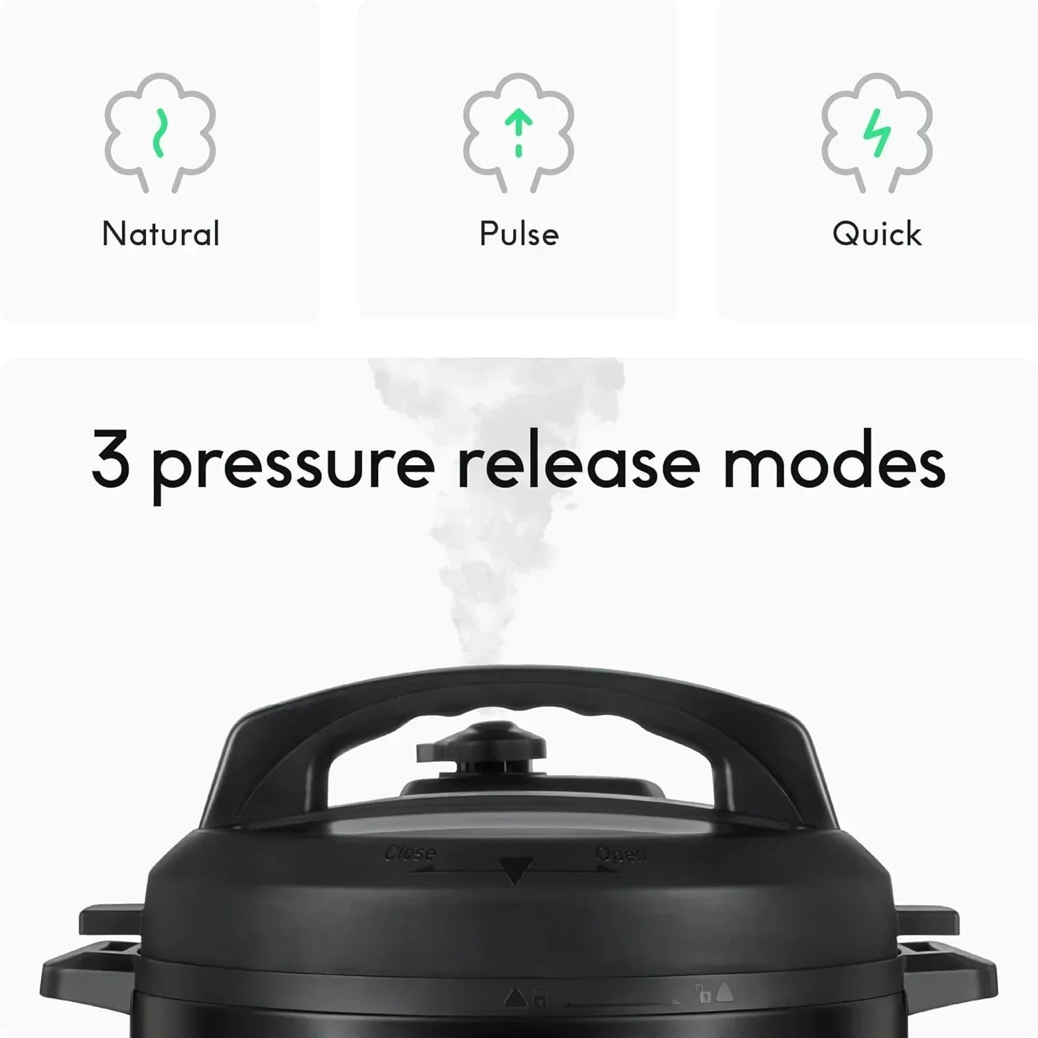 For even more safety and convenience, your Smart Cooker releases steam for you at the end of pressure cooking. Plus, it's smart enough to use one of three release methods Rapid, Pulse, or Natural depending on what you're cooking.