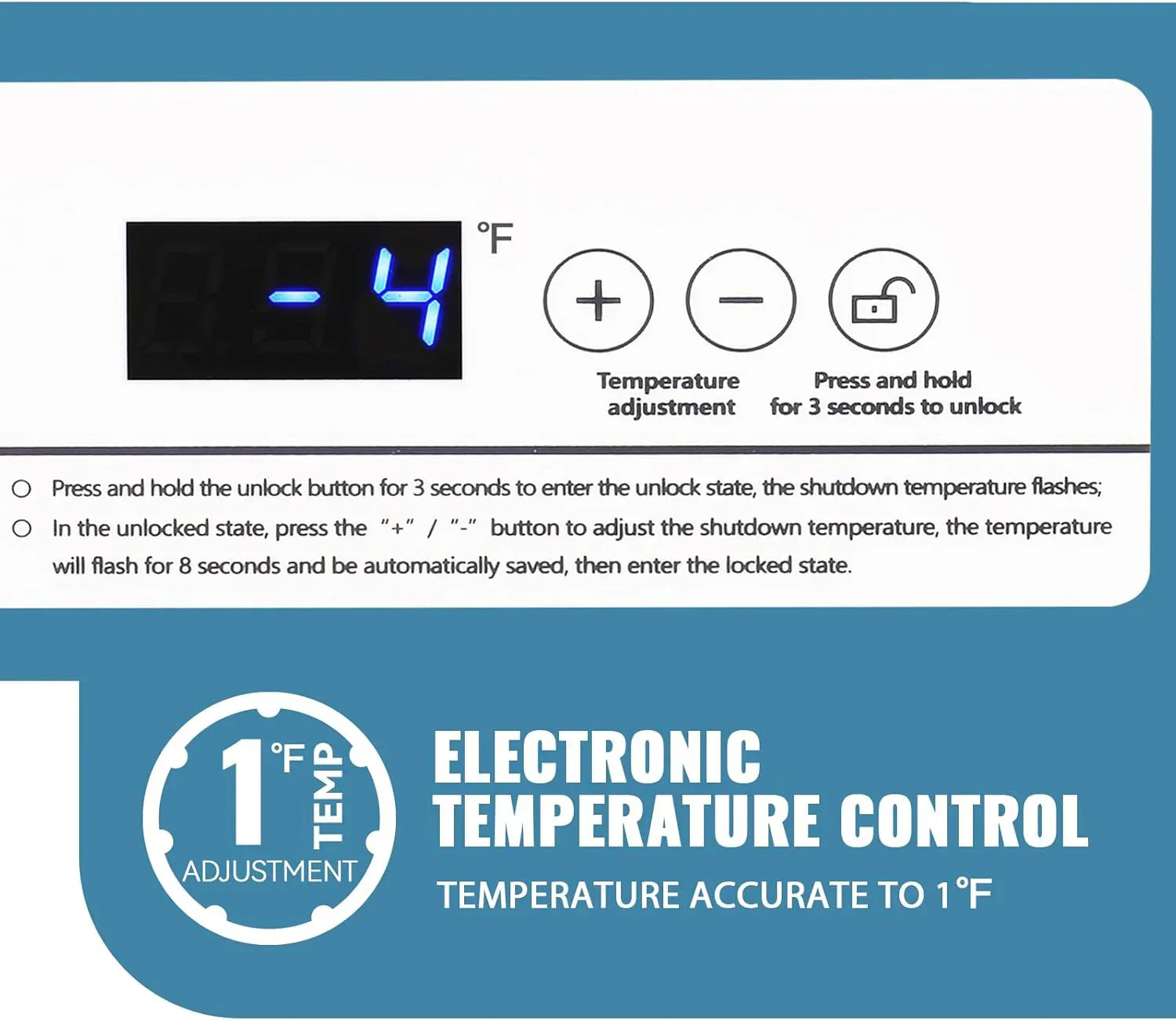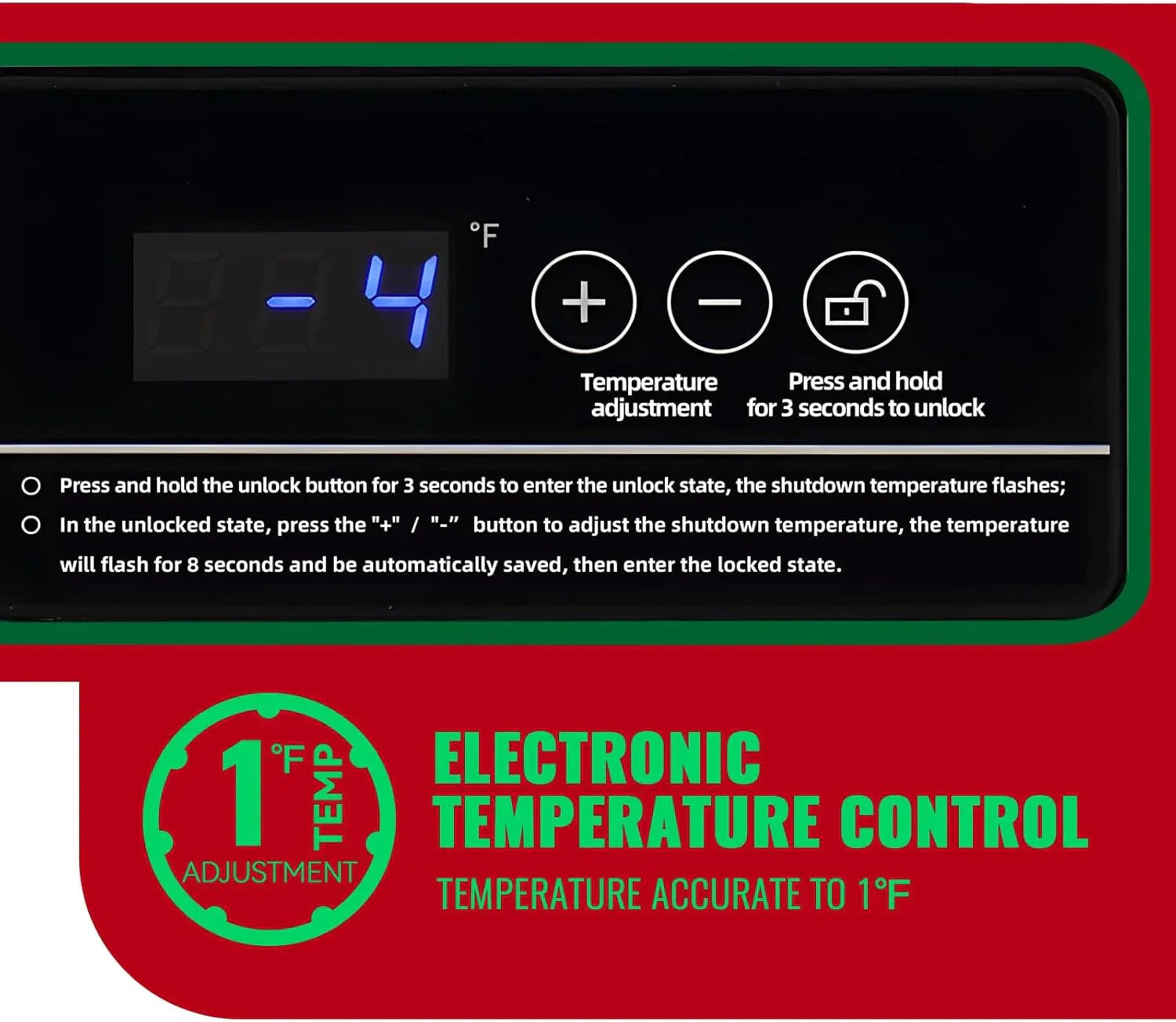 Intelligent digital display that can achieve precise temperature control to 1°F. Temperatures range from -15°F and 41°F
