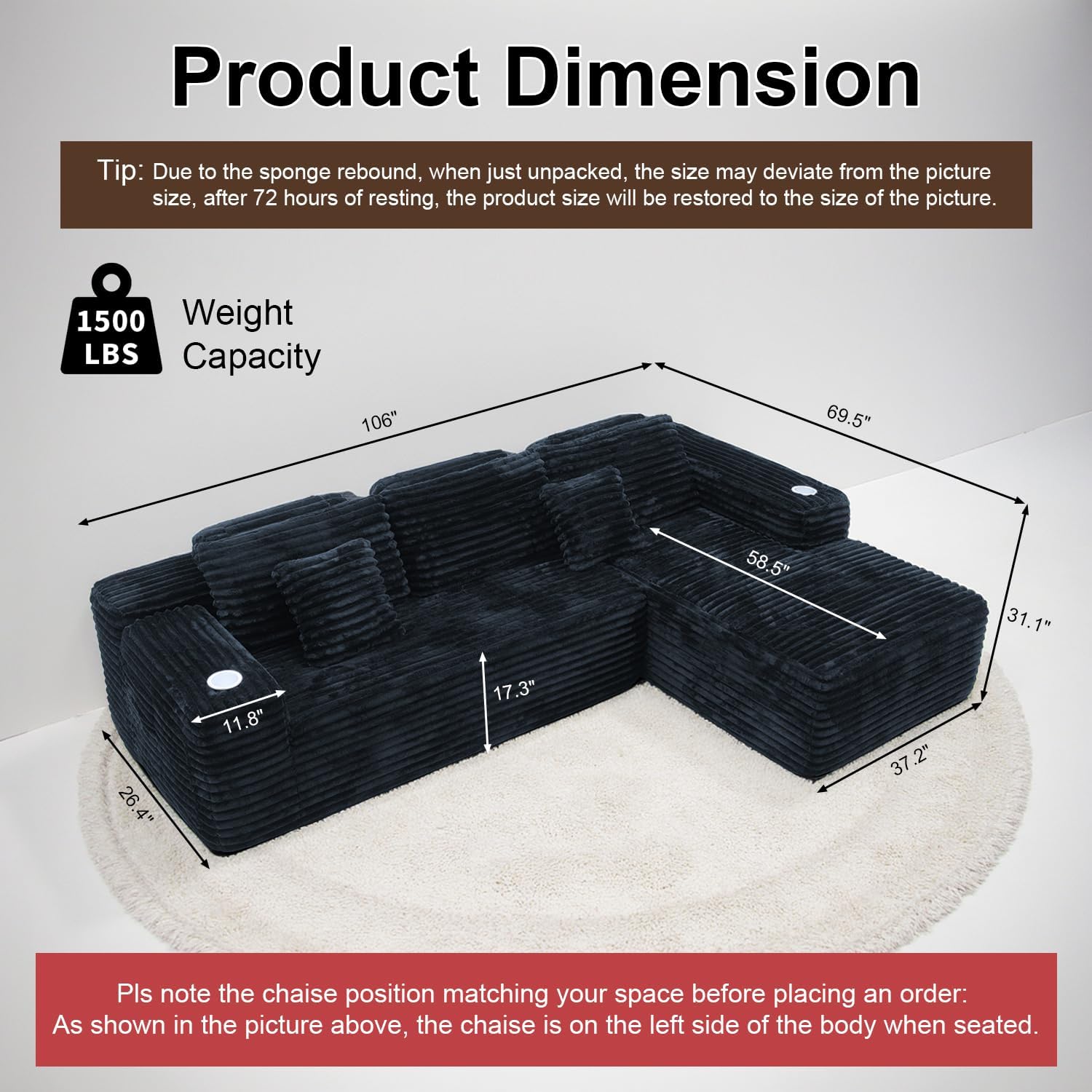 Item Dimensions D x W x H 69.5"D x 106"W x 31.1"H