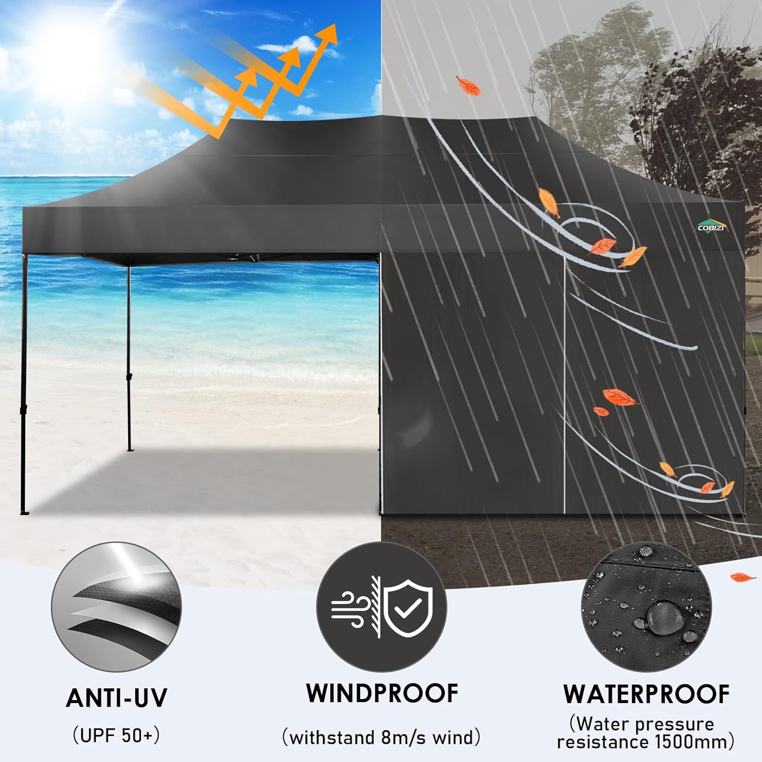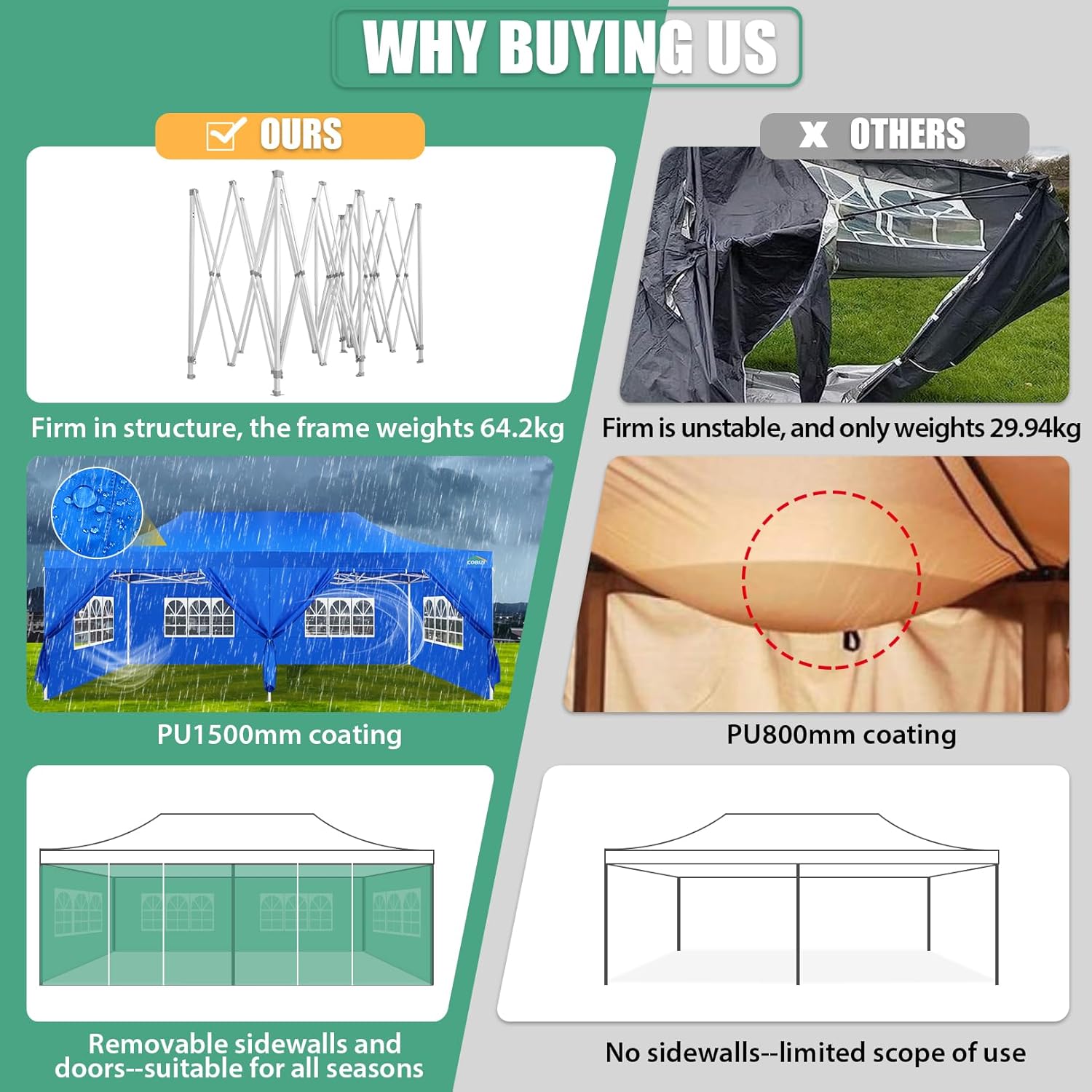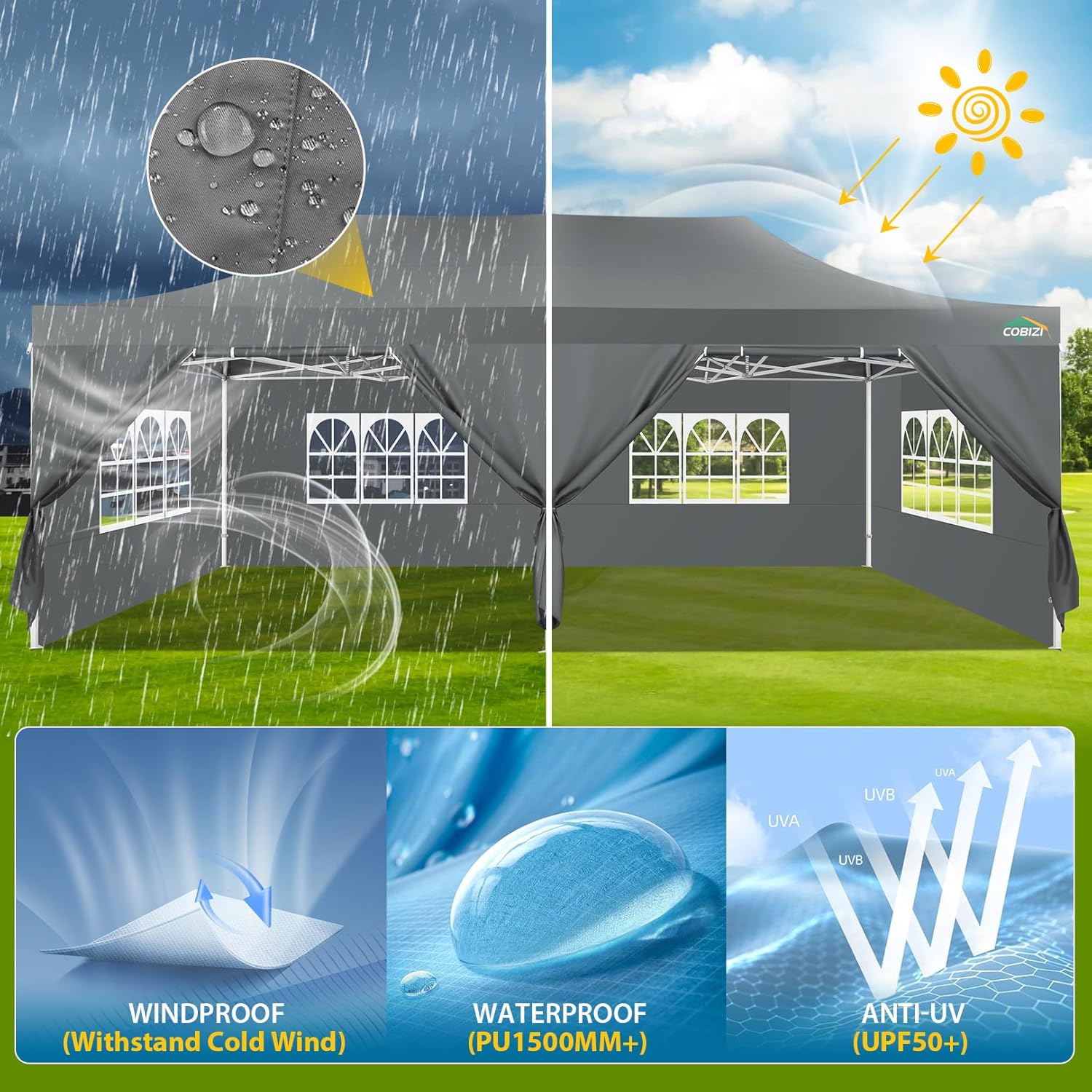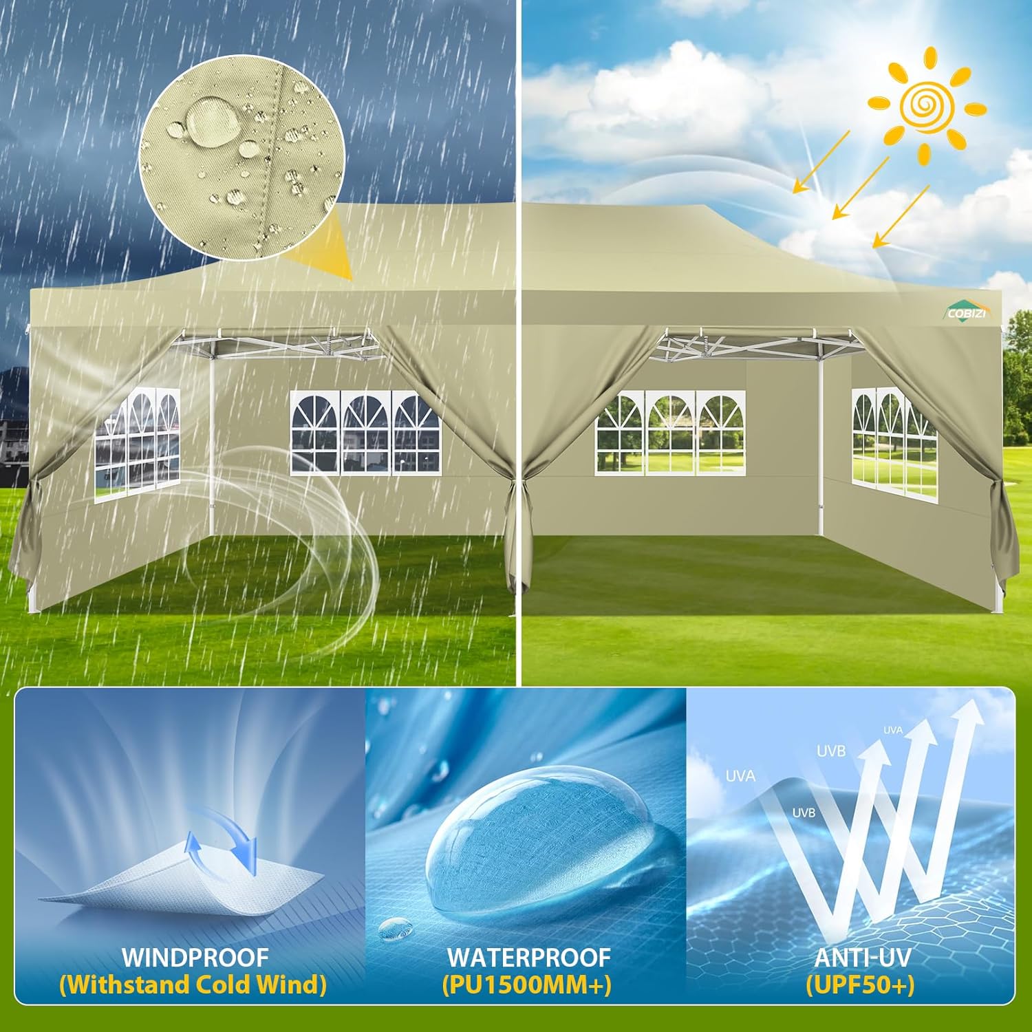- 【Premium Canopy and Sidewalls�?0x20 Party tent is made of 420D high quality Oxford with two layers of PU coating, UPF 50+, blocks 99% of the sun's rays. Seams are fully sealed to prevent water leakage, 100% waterproof. Waterproof pressure is 2.1psi, while the waterproof pressure of general tents is only 1.1psi. 6 PU coated removable sidewalls are connected by a whole strip of hook and loop fastener and zipper for tying frame top and legs