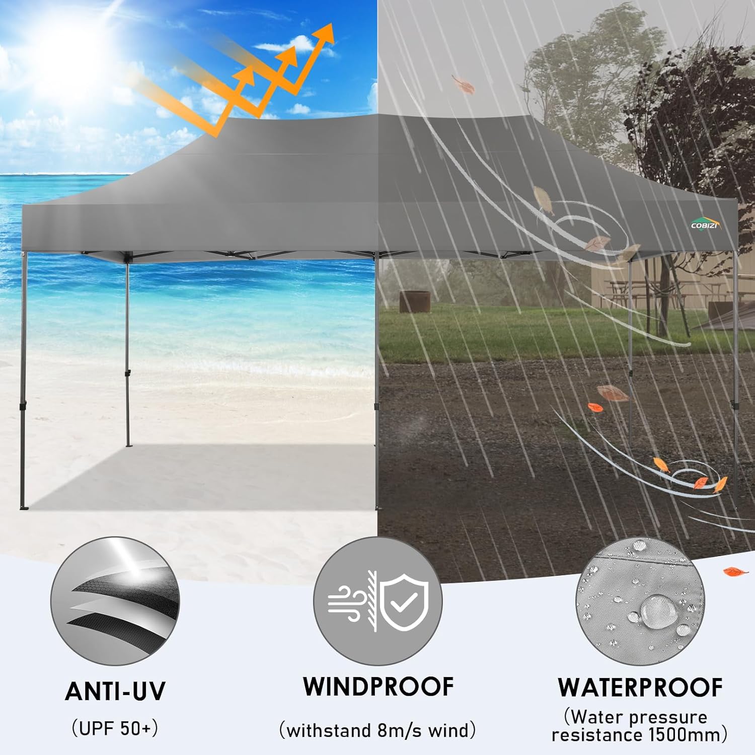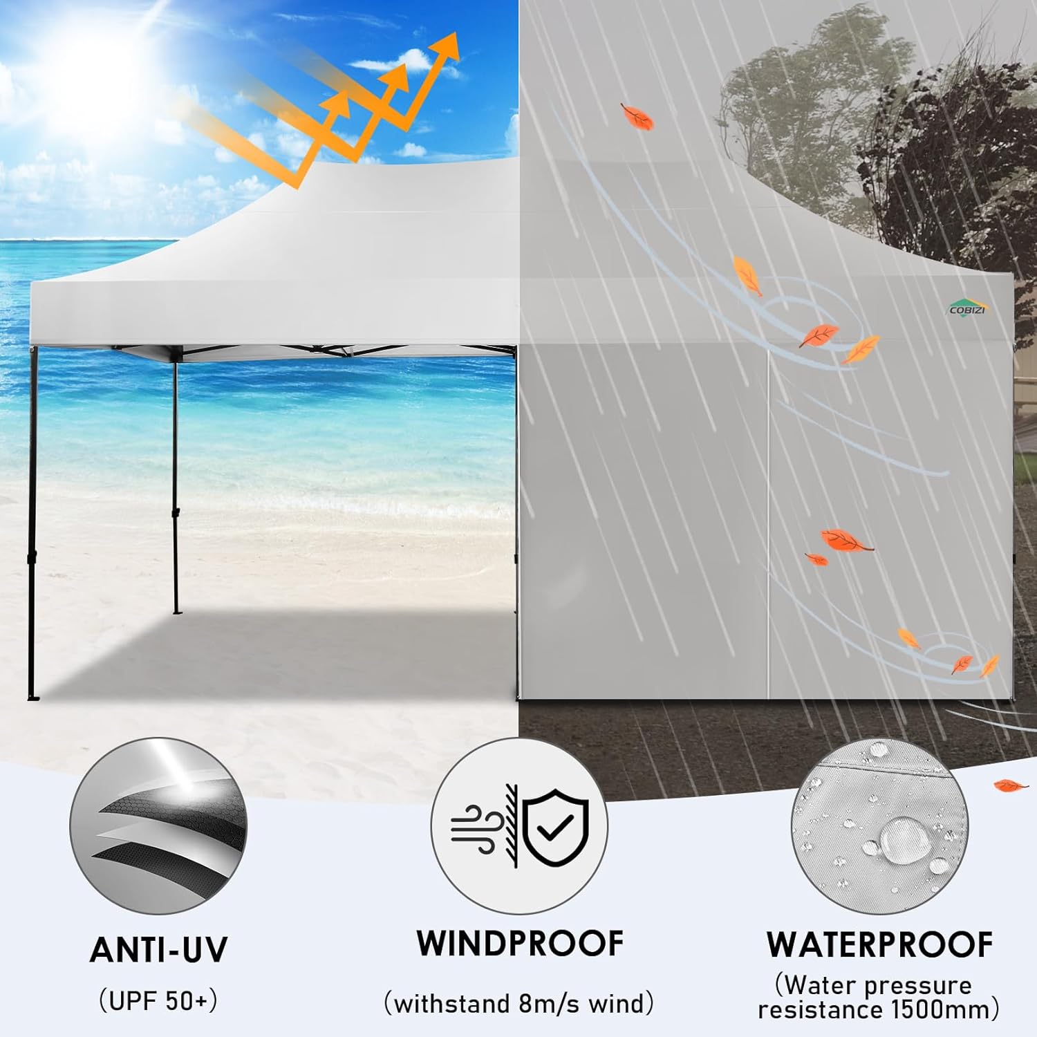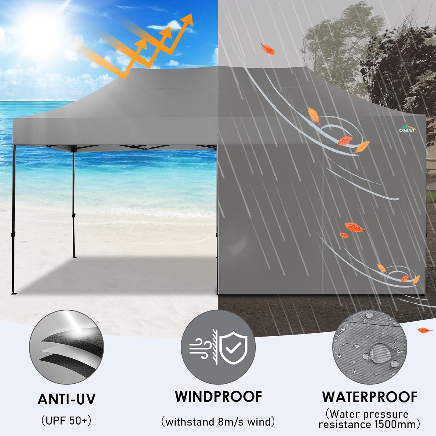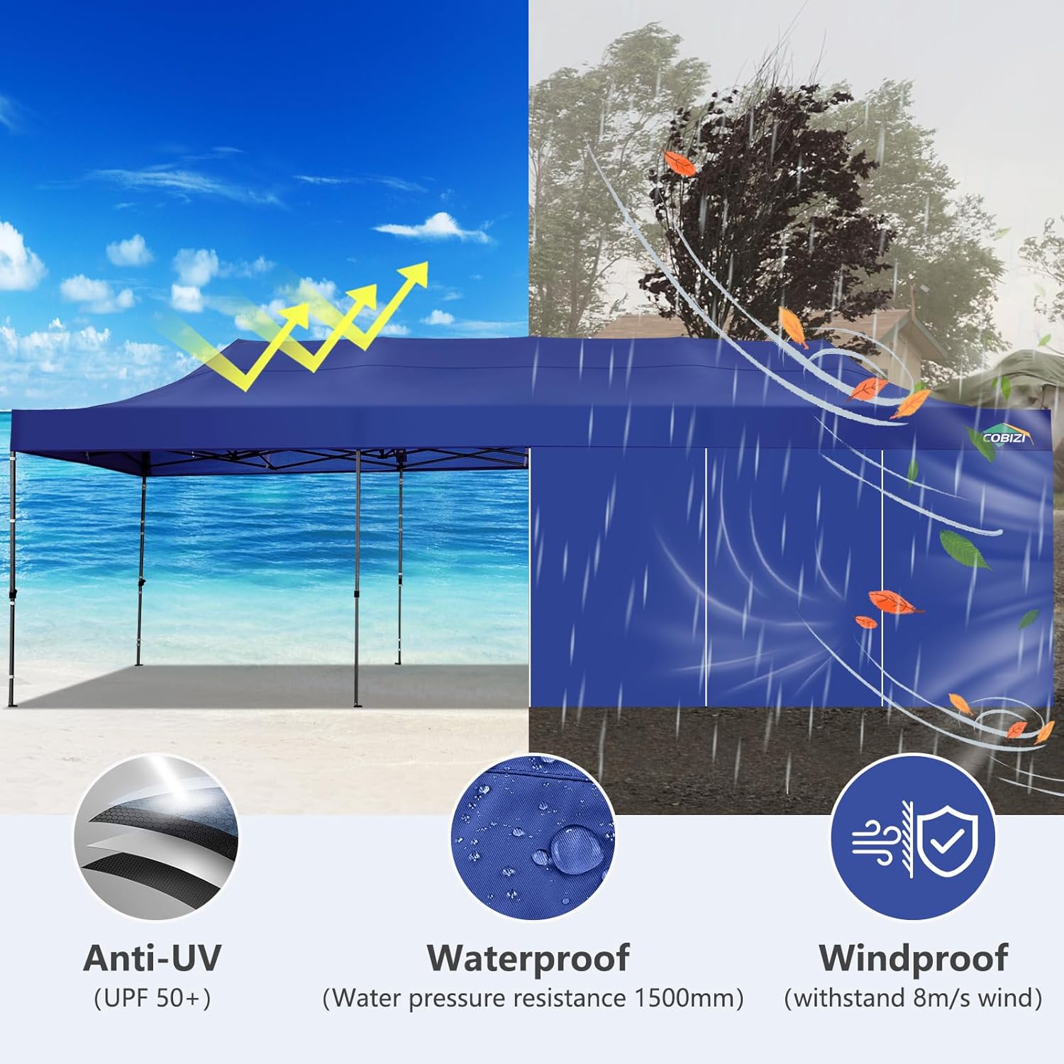 - 【Premium Canopy and Sidewalls�?0x20 Party tent is made of 420D high quality Oxford with two layers of PU coating, UPF 50+, blocks 99% of the sun's rays. Seams are fully sealed to prevent water leakage, 100% waterproof. Waterproof pressure is 2.1psi, while the waterproof pressure of general tents is only 1.1psi. 6 PU coated removable sidewalls are connected by a whole strip of hook and loop fastener and zipper for tying frame top and legs