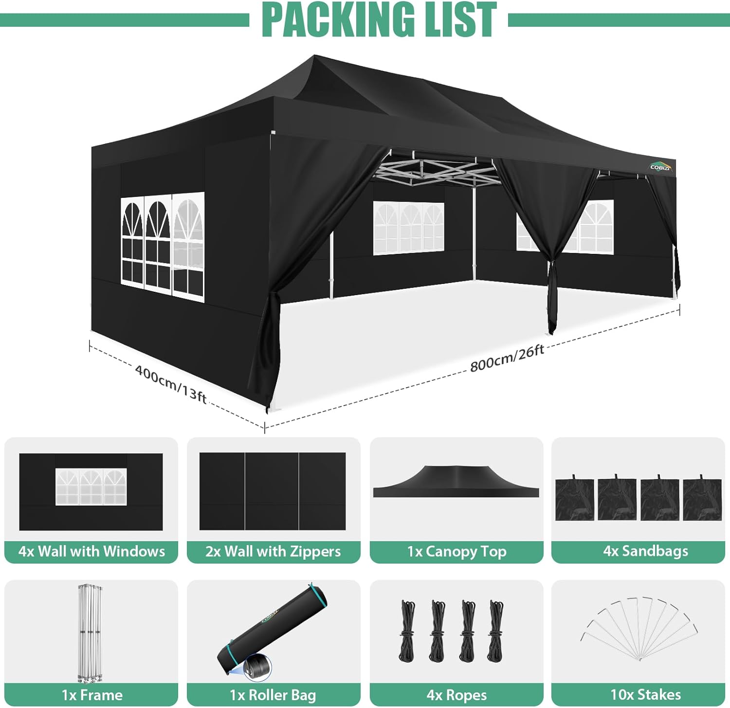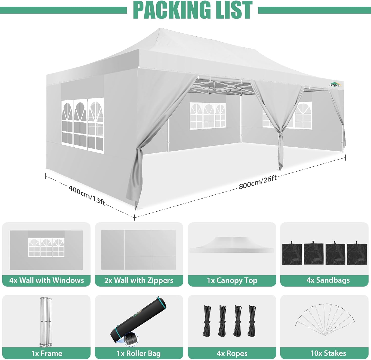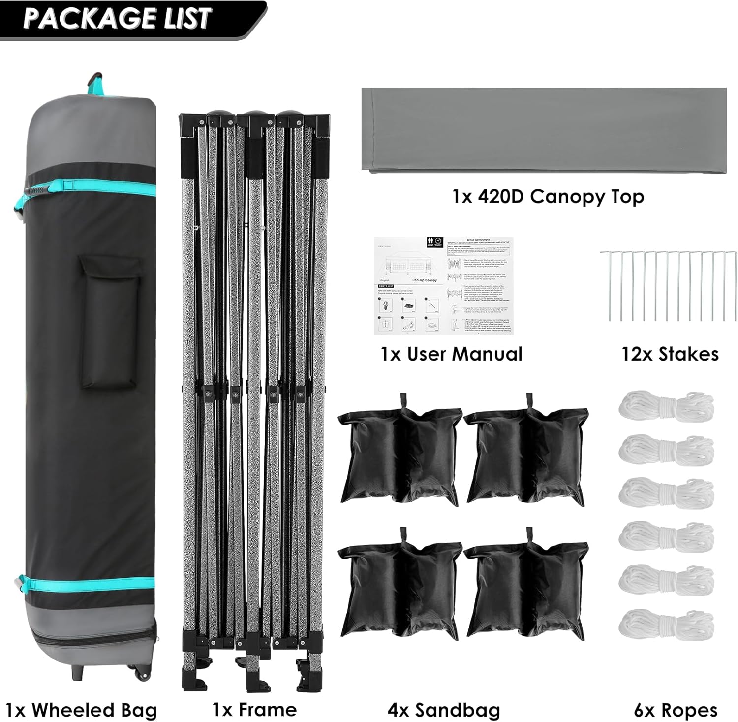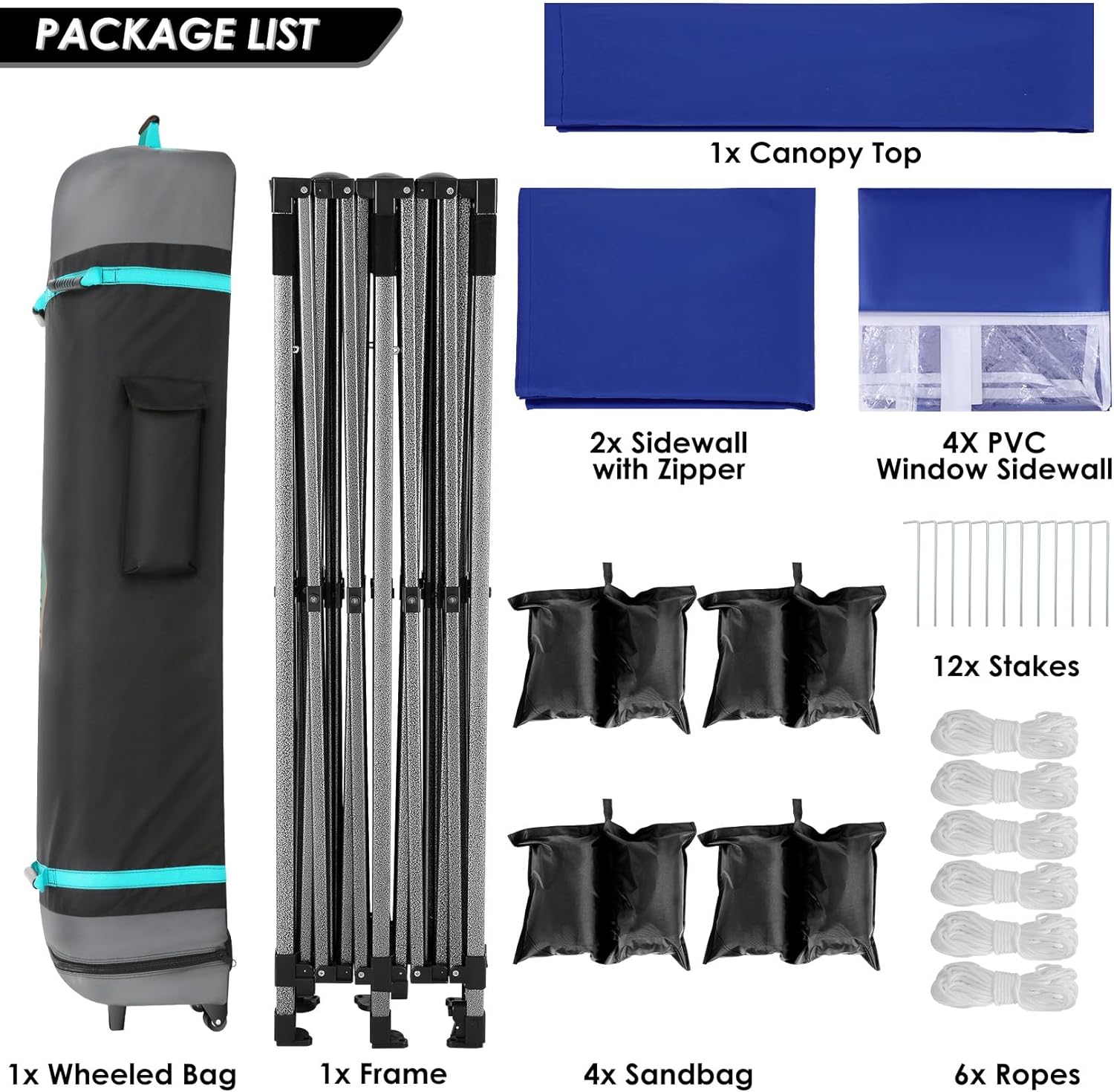 - 【Packing List�?x 10x20 Commercial Pop-up Canopy Frame, 1x 10x20 Canopy Top Cover, 6x PU coated Panels (4x SideWalls with Window and 2x SideWalls with Zipper), 4x 420D Oxford cloth PVC coated Sandbags, 12x Ground Pegs, 6x Wind Ropes, 1x Wheeled Bag, 1x Manual. We provide you with the best service, if you have any questions and doubts, please feel free to contact us. Choosing us will be a right decision