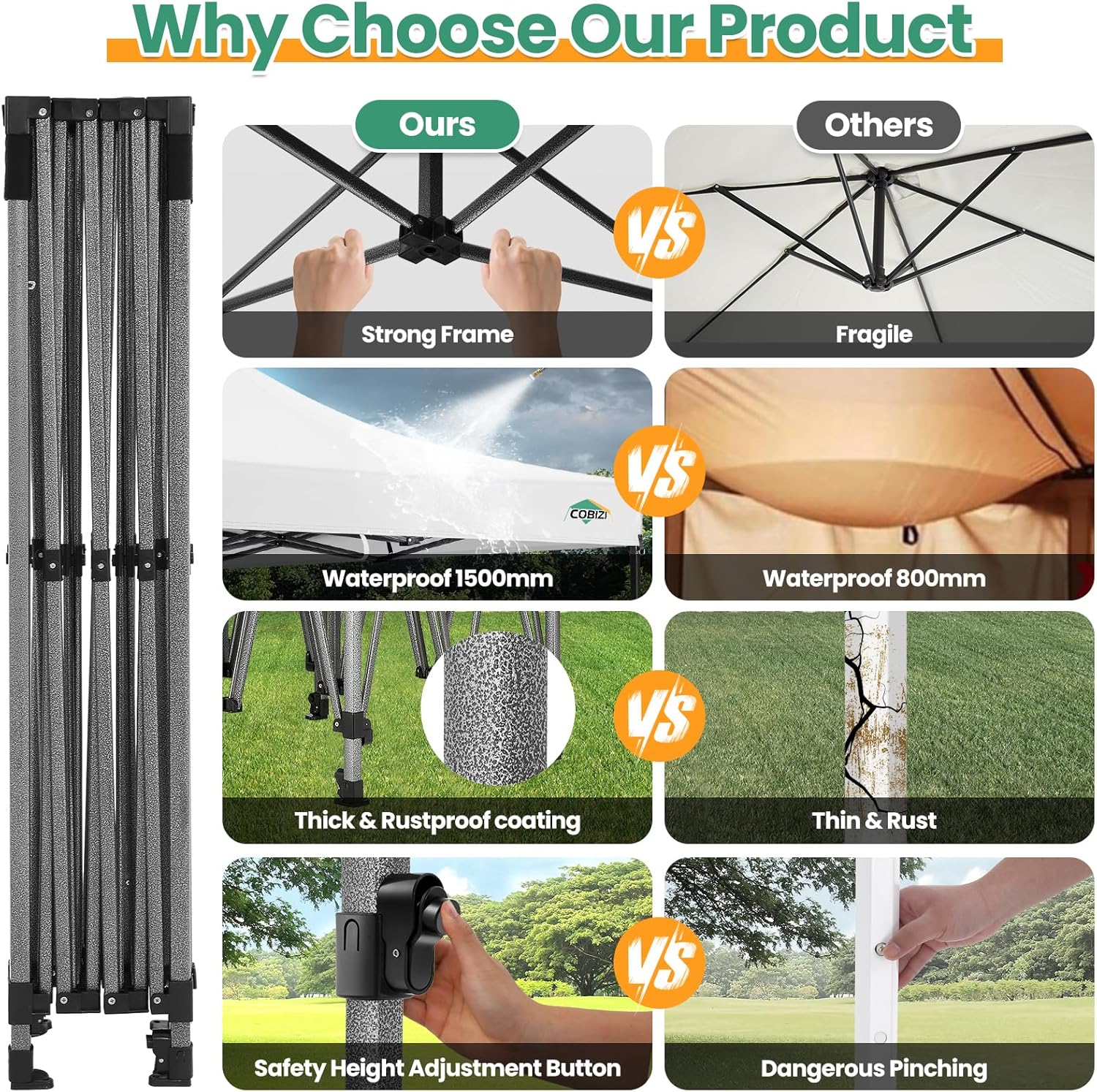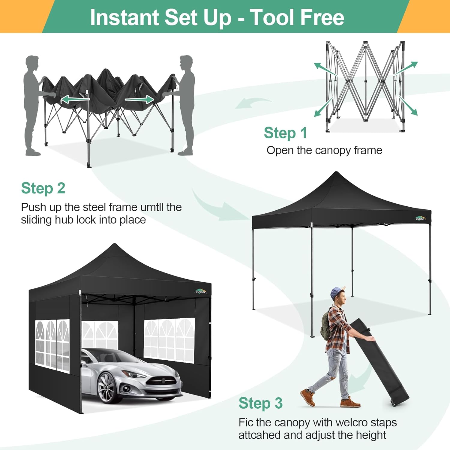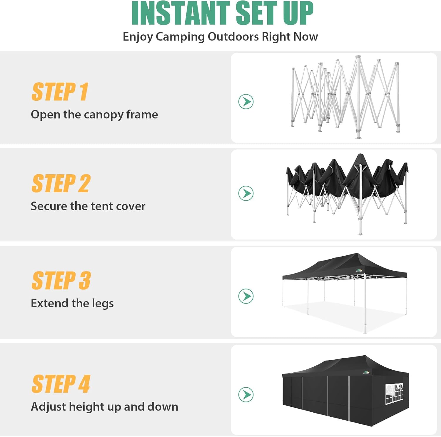 - 【Quick & Easy Setup, 3 Heights�?0x20 Pop up tent can be quickly installed and dismantled by 2-3 people in minutes without tools, easily accommodates 15-20 people. Simply take the fully assembled frame out of the bag, place the fabric over it, stretch legs and done. You can adjust heavy duty canopy in 3 different heights (86", 90", 94") according to your needs with thumb button to provide enough headspace. Upgraded thumb latch system is easy to lock and release, protecting fingers from pinching
