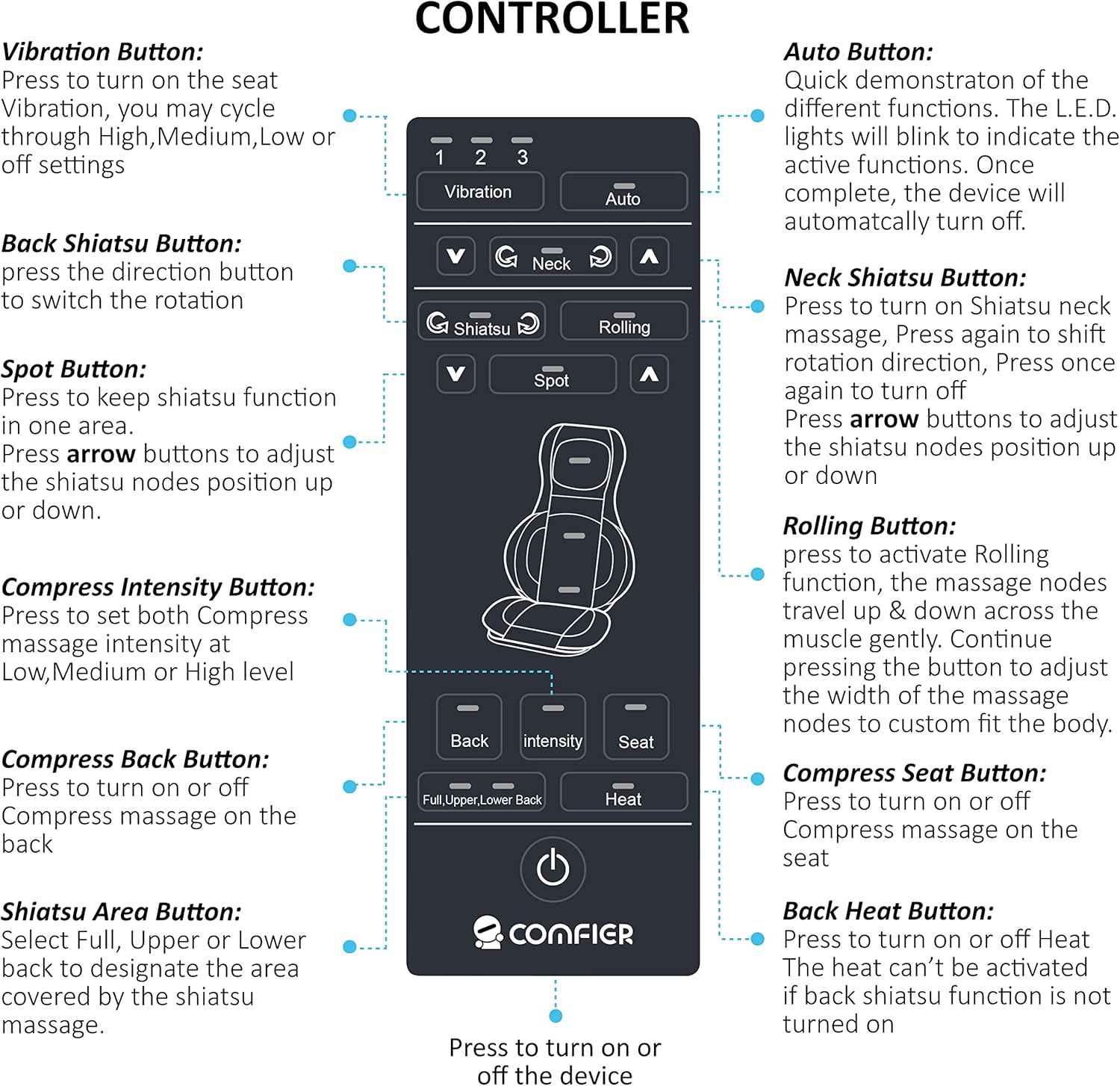 Comfier Seat Massager has 4 Shiatsu nodes for neck and shoulder massage,the shiatsu balls position can be adjusted to meet specific user.