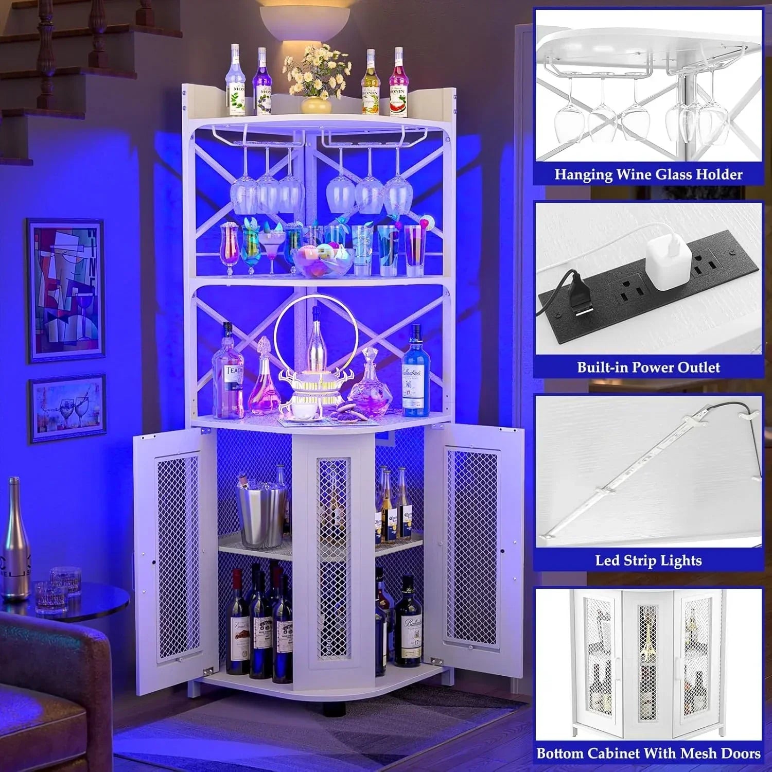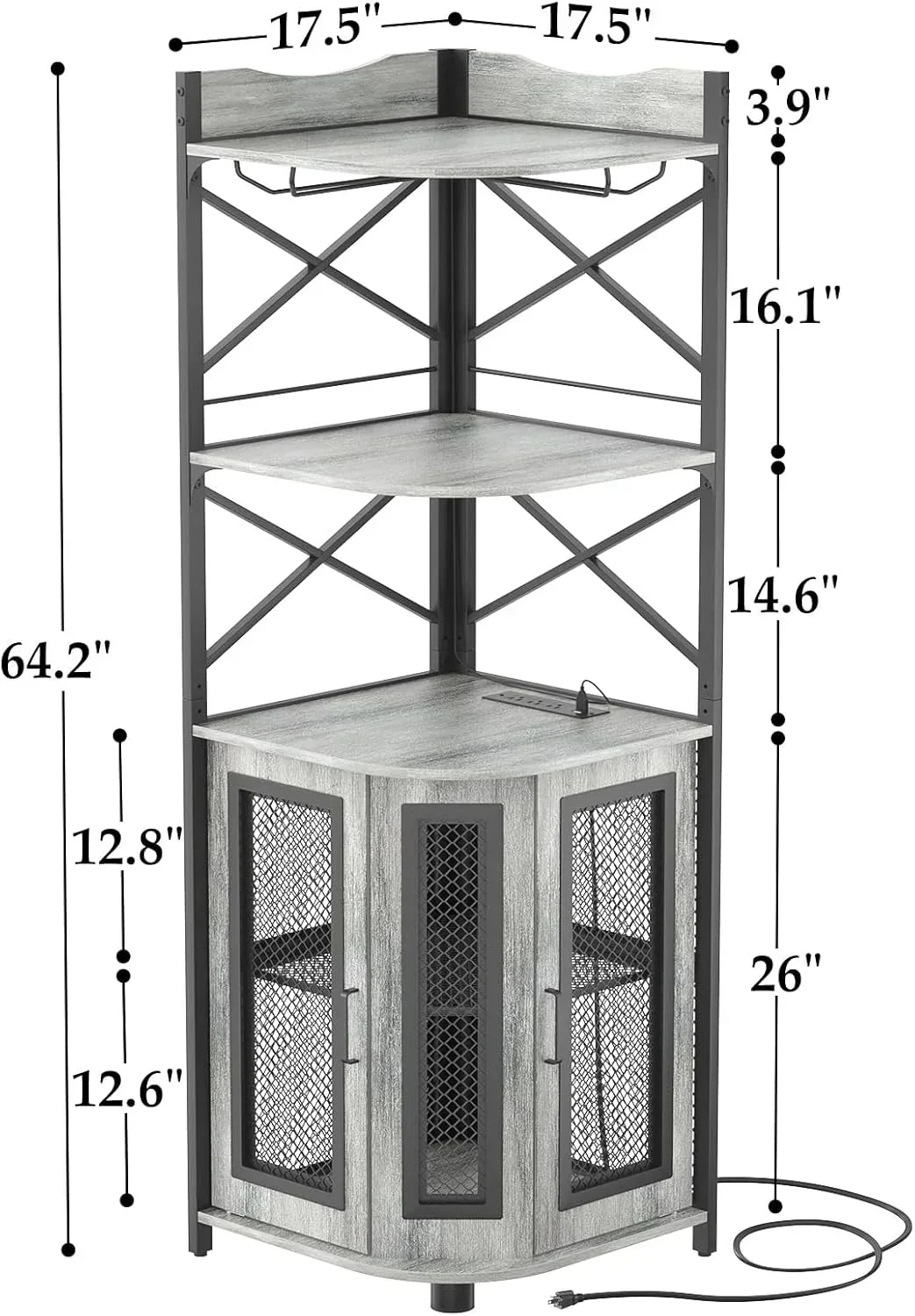 Industrial Corner Wine Cabinet with Charging Station, LED Strip, Glass Holder, Liquor Cabinet for Home