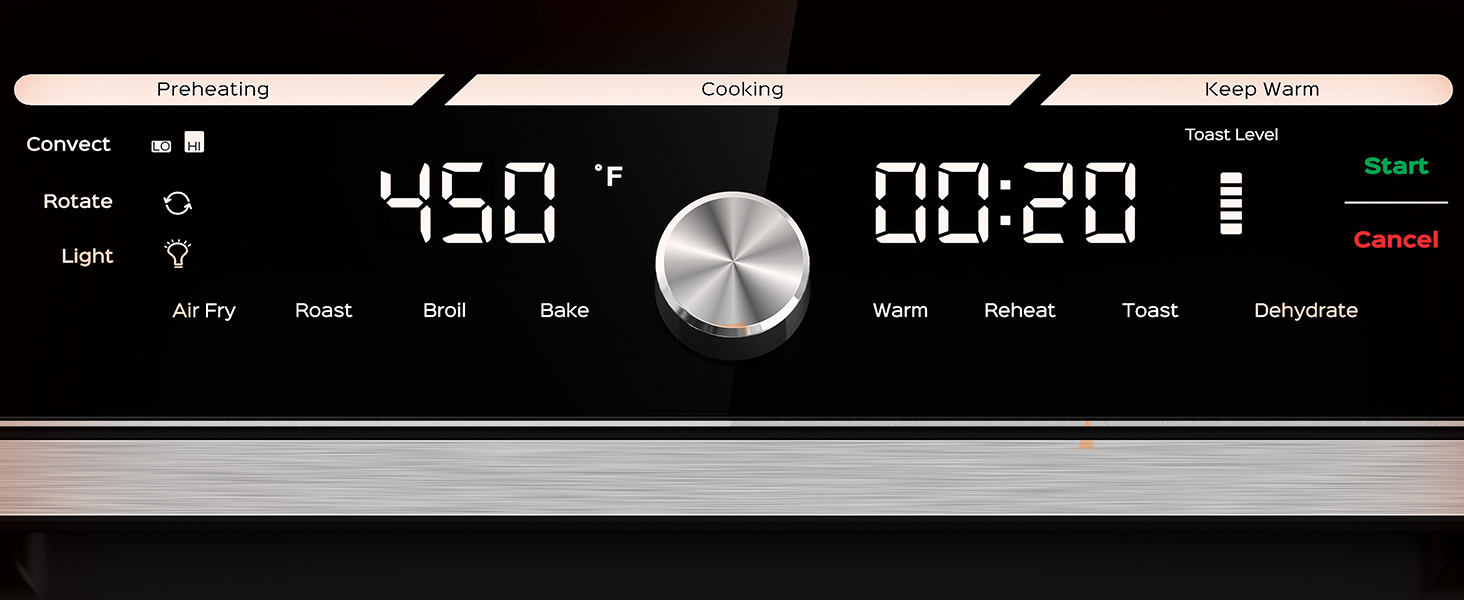 10 Cooking Functions: Air fry, bake, broil, dehydrate, toast, reheat, roast, warm, convection bake, or use the rotisserie spit, all in one easy appliance with little to no preheating time.