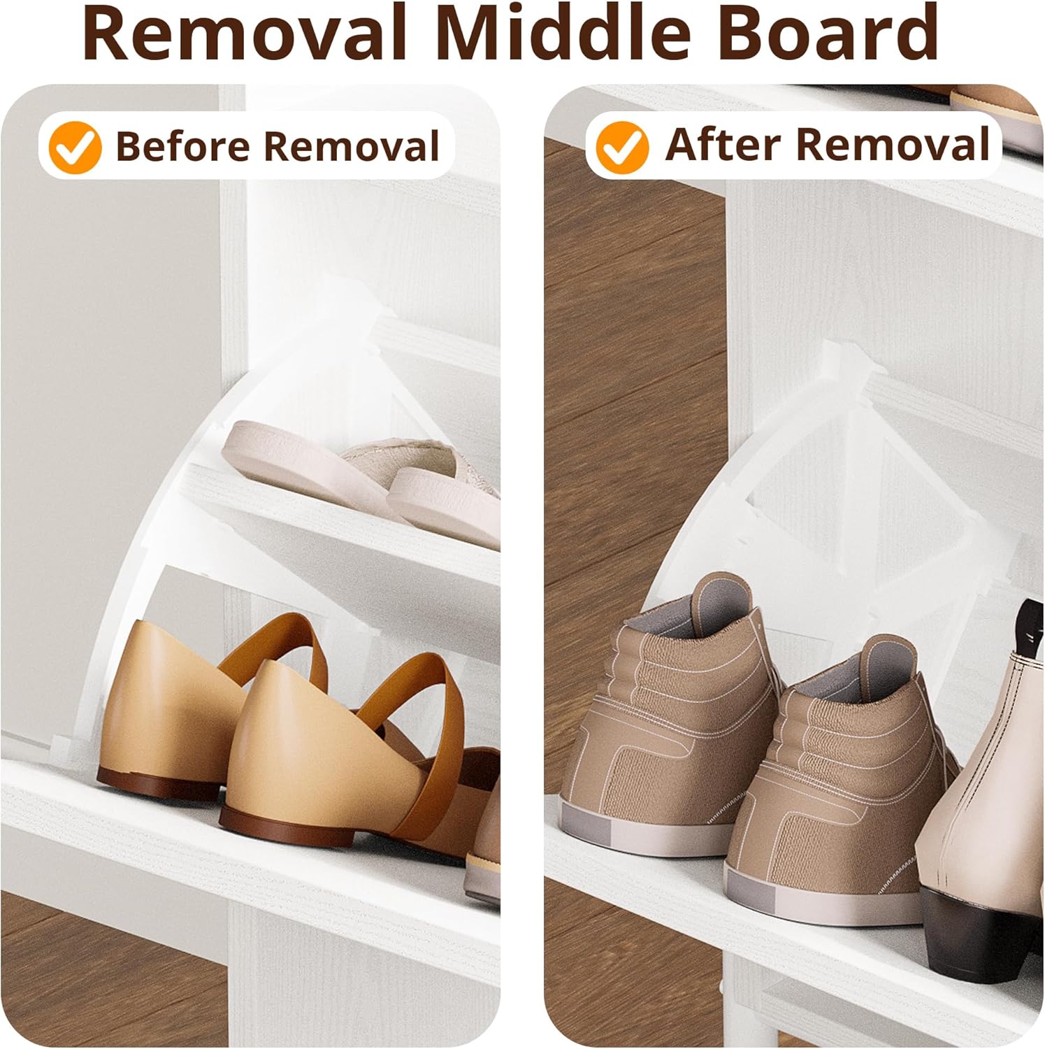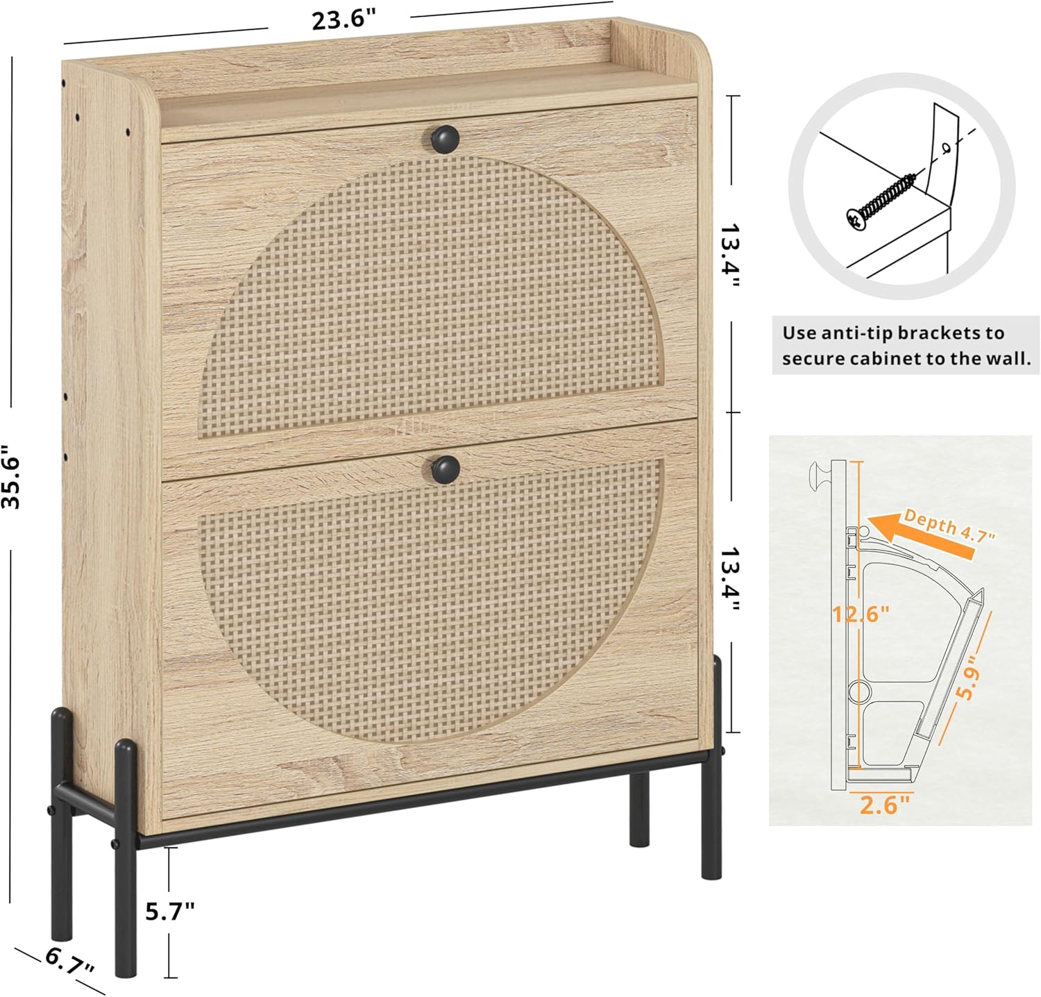 THIS SHOE STORAGE CABINET IS CRAFTED FROM HAND-WOVEN RATTAN AND MDF WOOD PANELS. It Comes In Natural Classic Colors With A Half-Circle Pattern, Giving It A Simple And Stylish Look That Brings Warm, Cozy Tones To Your Living Area, Suitable For Most Home Styles.