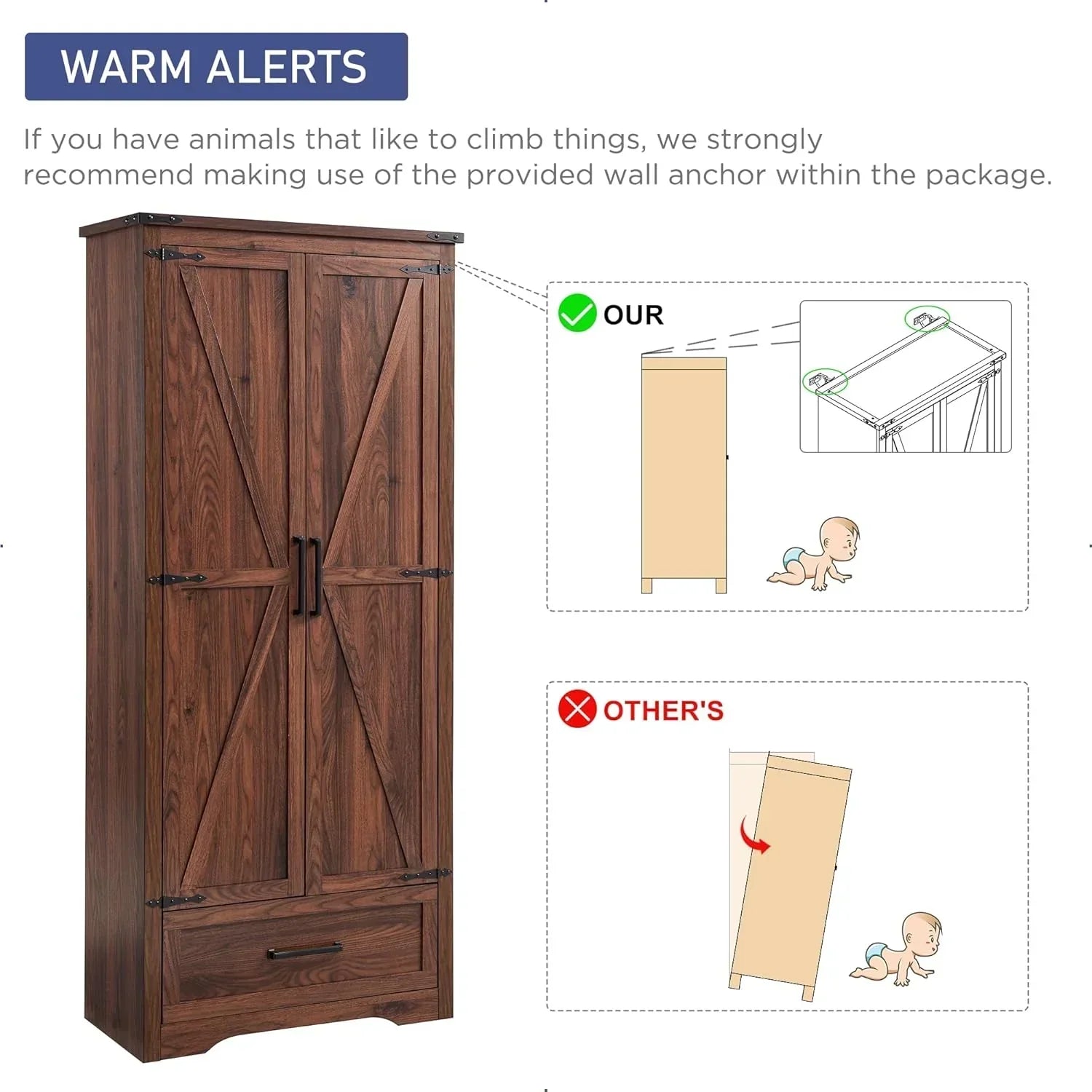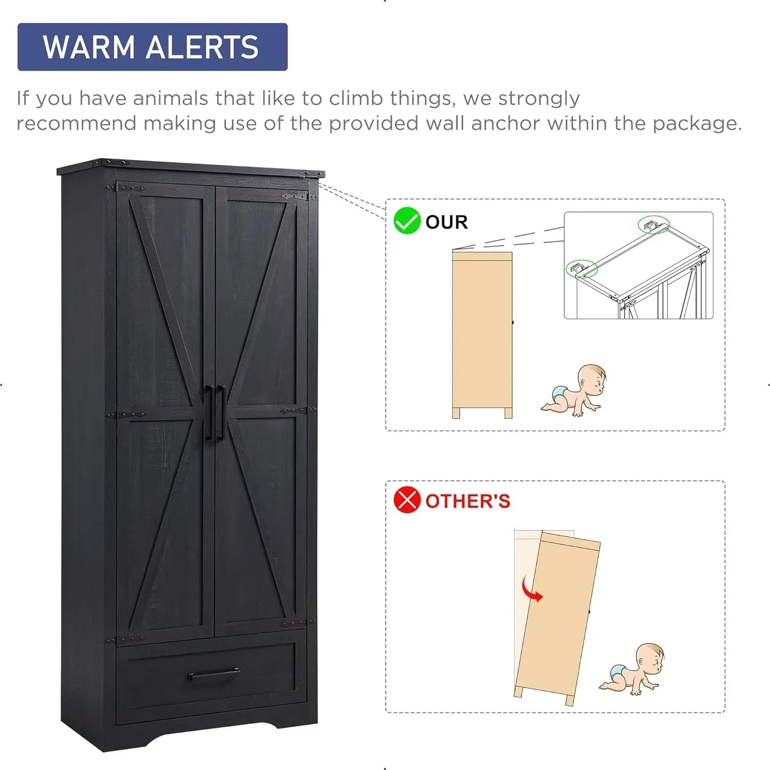 If you have animals that like to climb things, we strongly recommend using the provided wall anchor anti-tipper within the package. The anti-tipper is attached directly to the wall to prevent tipping and maximize safety and stability.
