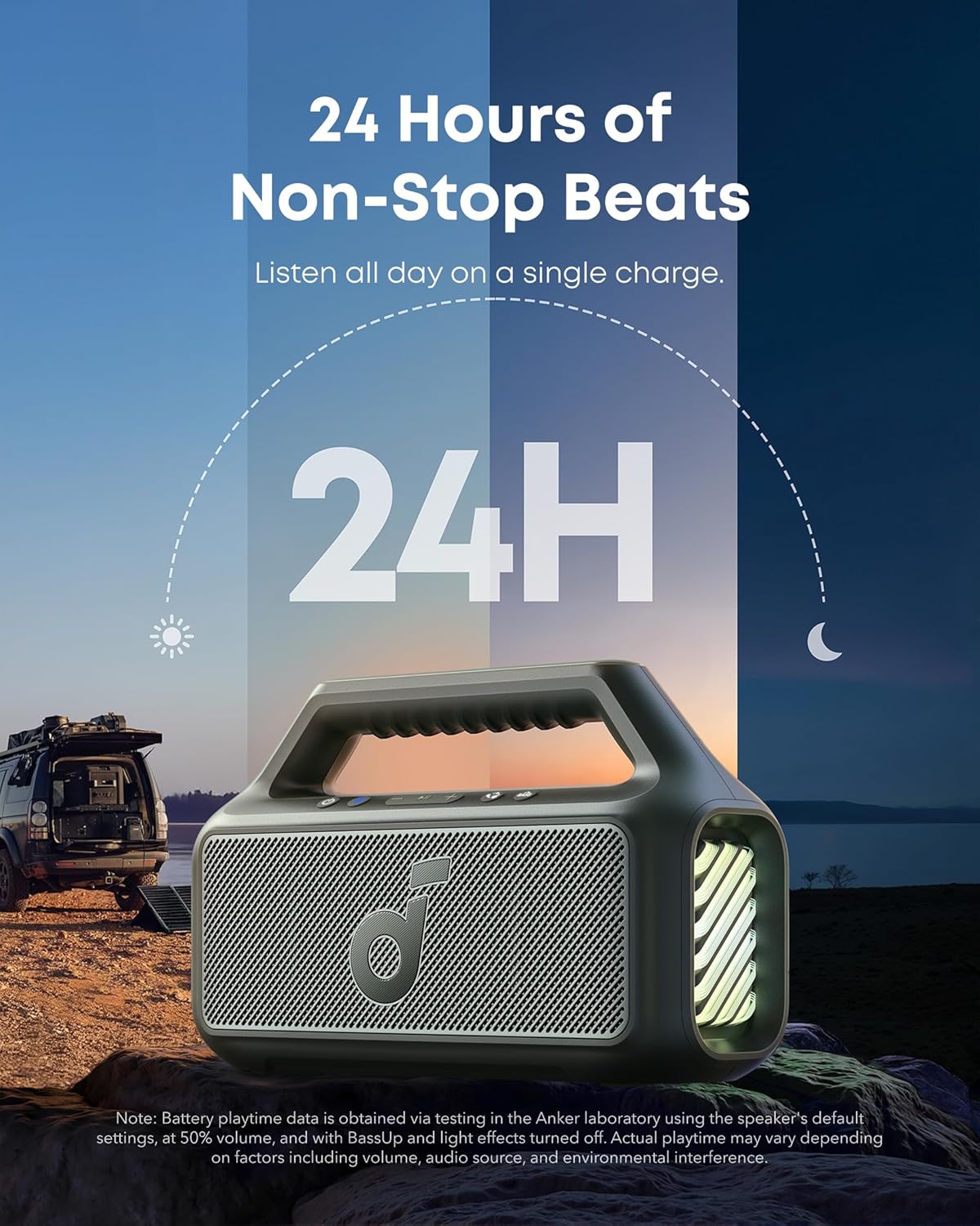 - Listen All-Day Anywhere: Boom 2 outdoor speaker keep the beats playing for 24 hours on a single charge, and with the built-in power bank, you can keep your phone powered up wherever you are. (Playtime may very based on volume level and playback content.)