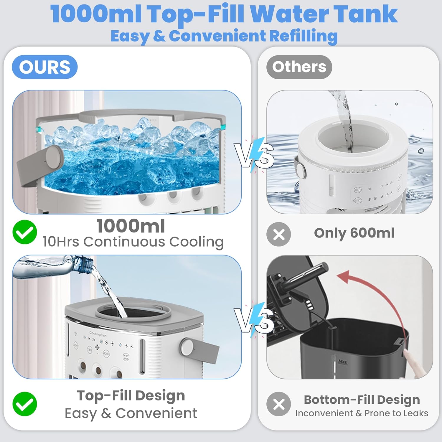 - 锟斤拷��锟斤拷锟�Long-Lasting Cooling with Large Water Tank��锟�?With a 1000ml top-fill water tank, this indoor cooling fan provides up to 10 hours of continuous refreshing breeze. Plus, its water-shortage protection automatically switches to fan mode when the water runs out, ensuring uninterrupted comfort.