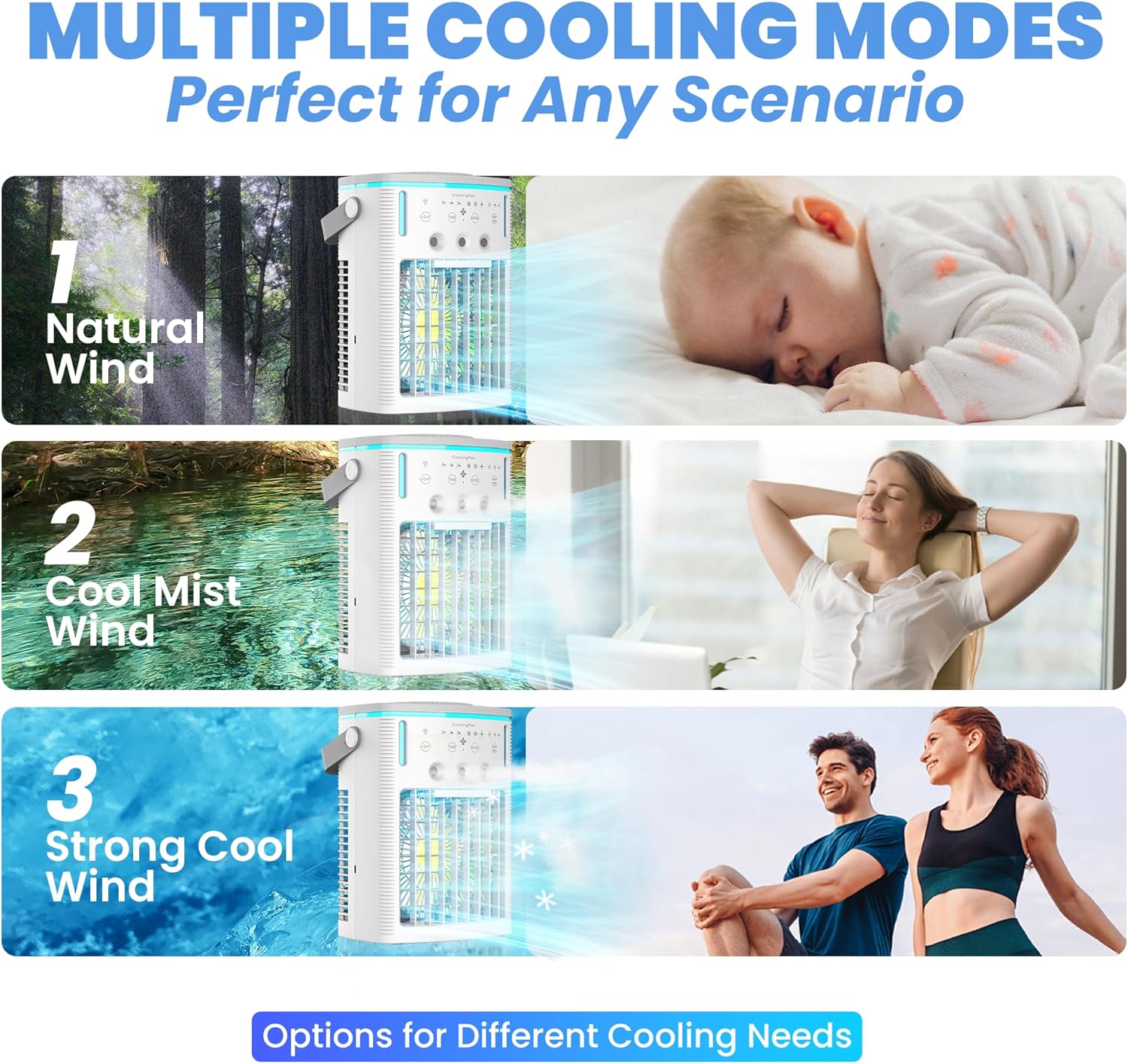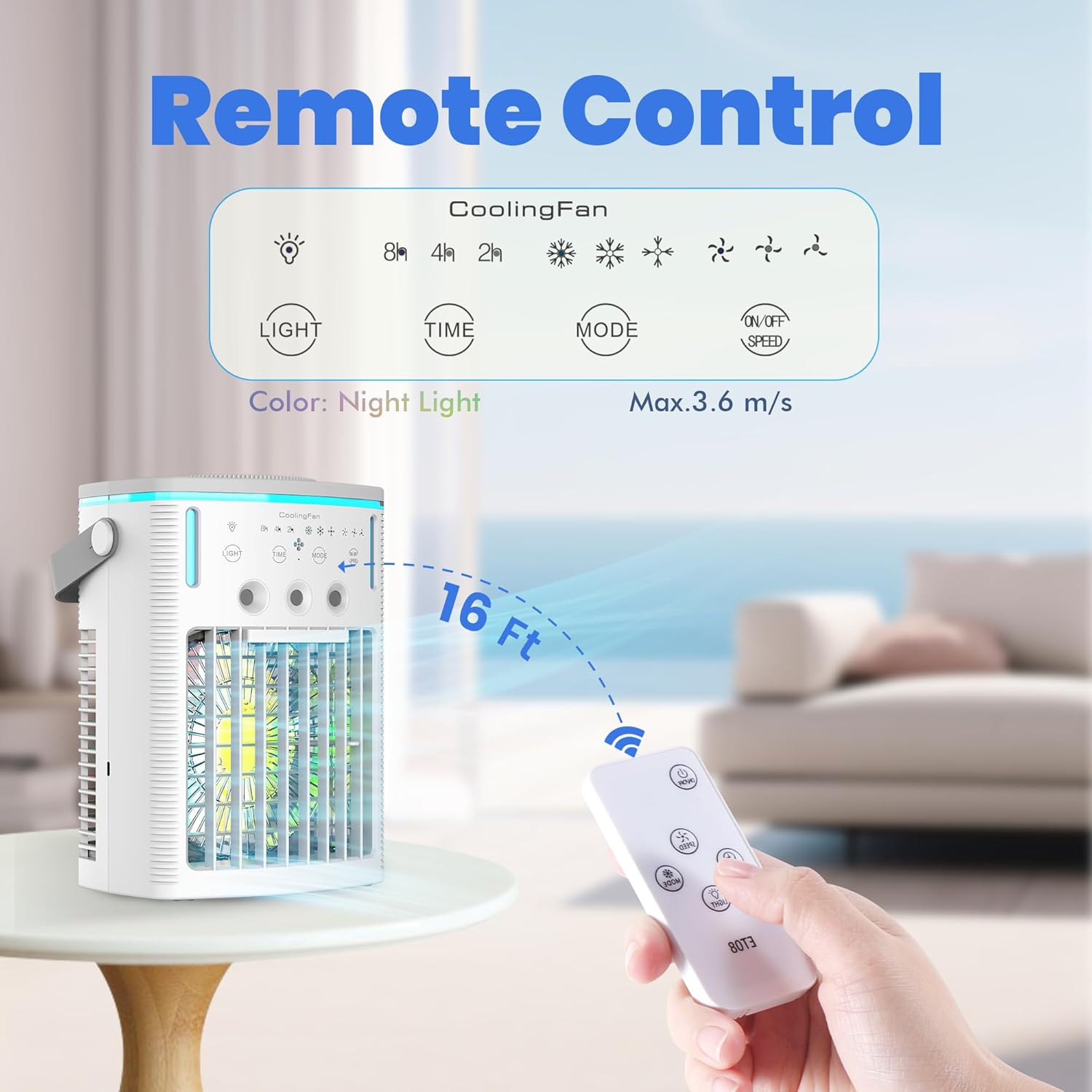 - 锟斤拷��锟斤拷锟�Easy to Use with Full Features��锟�?This portable cooling fan comes with an intuitive control panel and remote control, making it easy to operate. It offers 3 fan speeds (low/medium/high) and 3 cooling modes, along with an automatic timer (2H/4H/8H) and a 7-color LED night light. With low-noise operation, it helps you stay cool and relaxed all summer long.