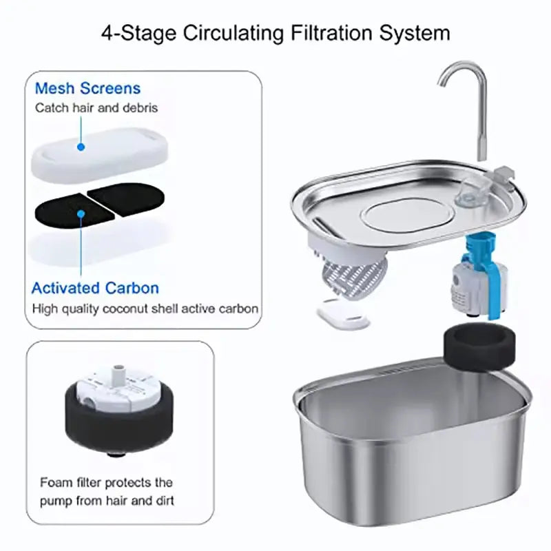 Capacity: 3.2L / 108oz Bowl material: Rust-resistant, corrosion-resistant metal, BPA-free, dishwasher-safe Base and housing: BPA-free plastic, hand-wash only Pump: Quiet submersible pump, USB-powered (5V, 1.5W) Noise level: Under 35dB during normal operation Filter type: 4-stage (cotton pre-filter + activated carbon + ion exchange resin + sponge) Product weight: 0.81kg / 1.79lb Suitable for: Cats and small to medium dogs