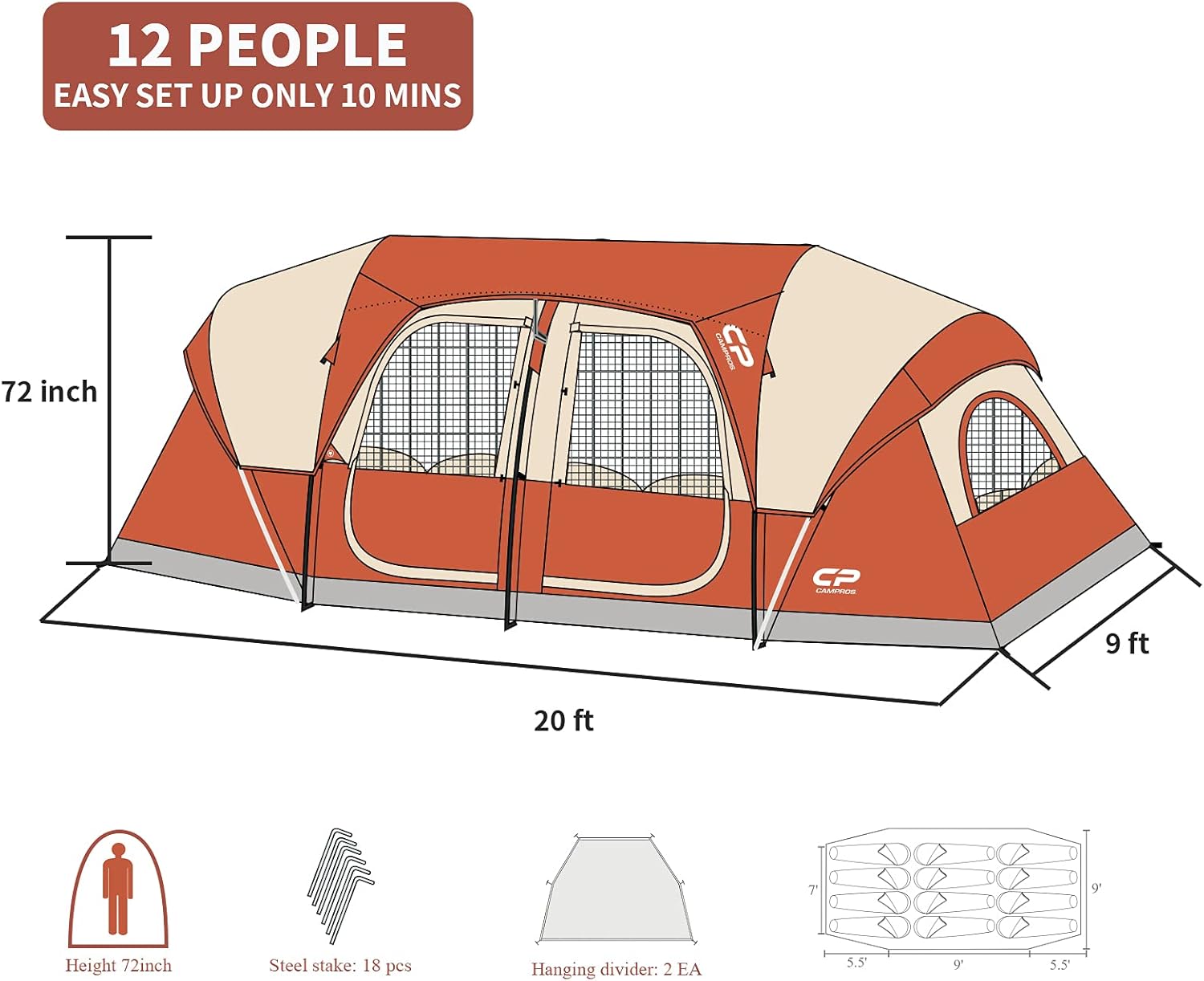 CAMPROS CP Tent 12-Person-Camping-Tents,3 Room Family Tents,Waterproof Windproof Family Tent with Top Rainfly,6 Large Mesh Windows,Double Layer,Easy Set Up, Portable with Carry Bag-20' x 9' x 72"(H)