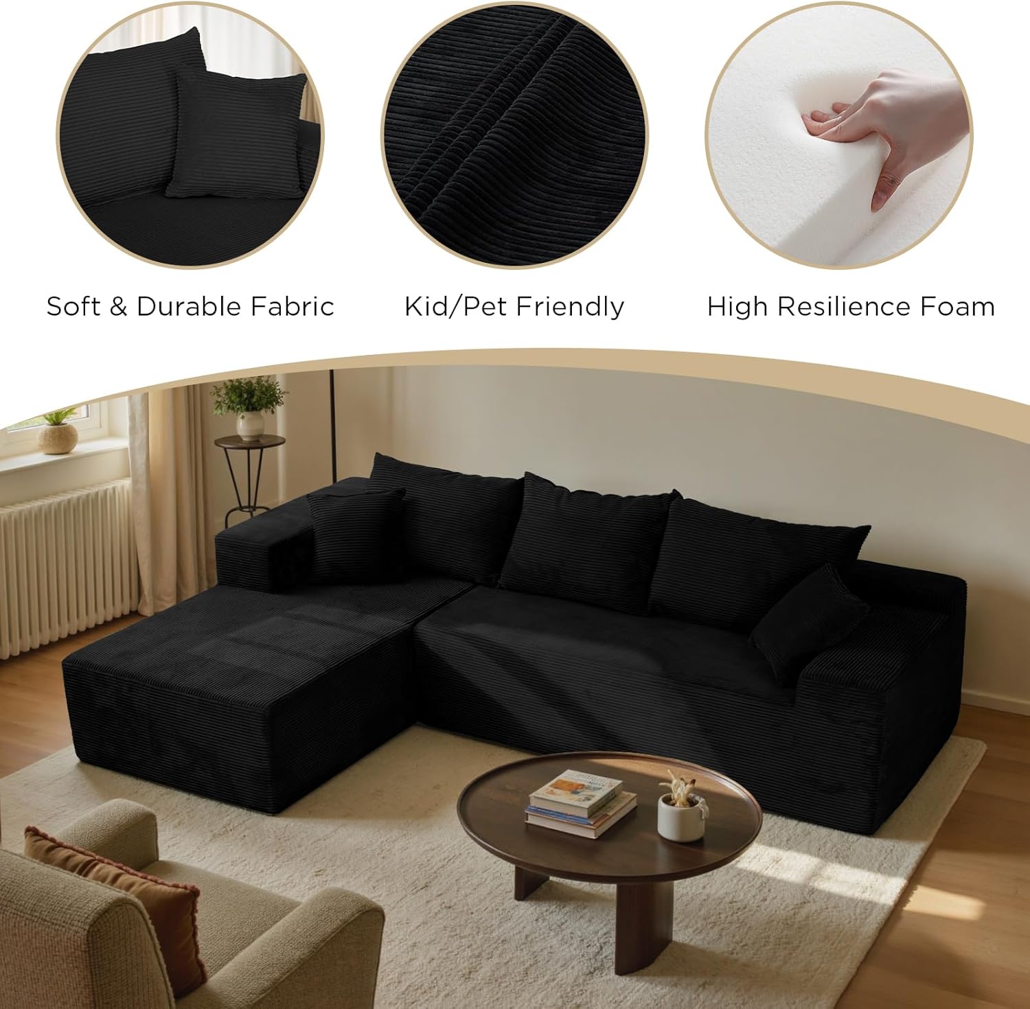 Cloud Sectional Couch with L-Shape Chaise Modern Modular Sofa with Deep Seat Modern Comfy Furniture Bedroom Lounge Dorm Office Apartment Home (Black, Left Facing Chaise)