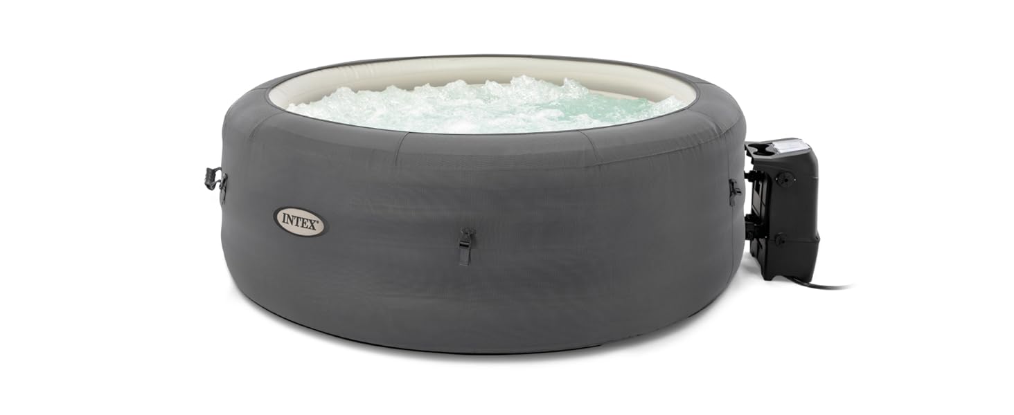 Intex SimpleSpa Bubble Massage hot tub placed beside a pool on a patio in a backyard setting. Intex SimpleSpa Bubble Massage hot tub placed beside a pool on a patio in a backyard setting.